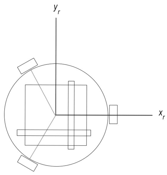 where θ 1 , θ 2 , θ 3 correspond to the fixed wheel orientation angles and ψ denotes the robot heading. The forward kinematic model, expressed in the robot frame, is used in this work to estimate the robot’s translational velocities from encoder-derived wheel speeds, enabling closed-loop navigation control during grid traversal. The kinematic model of the robot with respect to the plotter axis is shown in Figure 7.