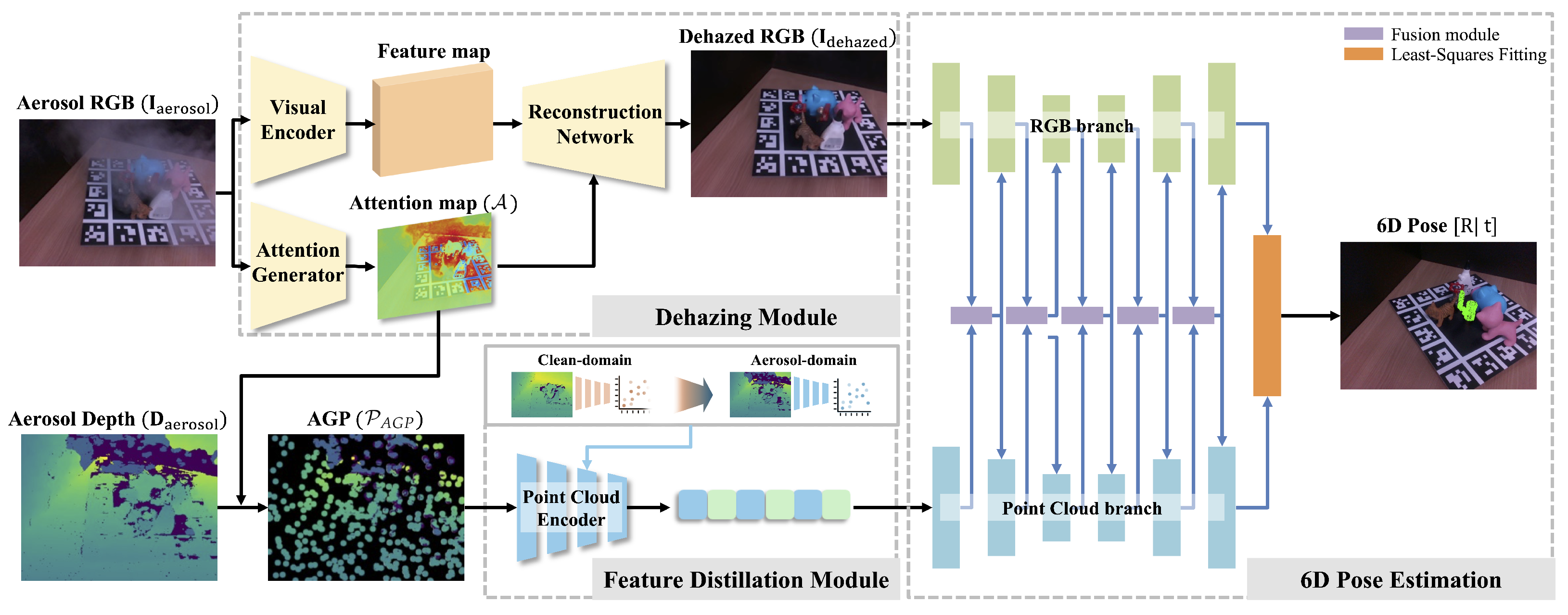The framework consists of a dehazing module for RGB restoration, a feature distillation module, and an attention-guided RGB-D 6D pose estimation module. The RGB dehazing module restores RGB images, and the attention map generated during this process quantifies depth reliability and is combined with the depth point cloud to construct an AGP. The RGB-D 6D pose estimation module predicts 6D pose through bidirectional feature fusion from the restored RGB and AGP. To enhance robustness with limited aerosol data, the feature distillation module uses AGP during training to align aerosol network features with clean network features.
