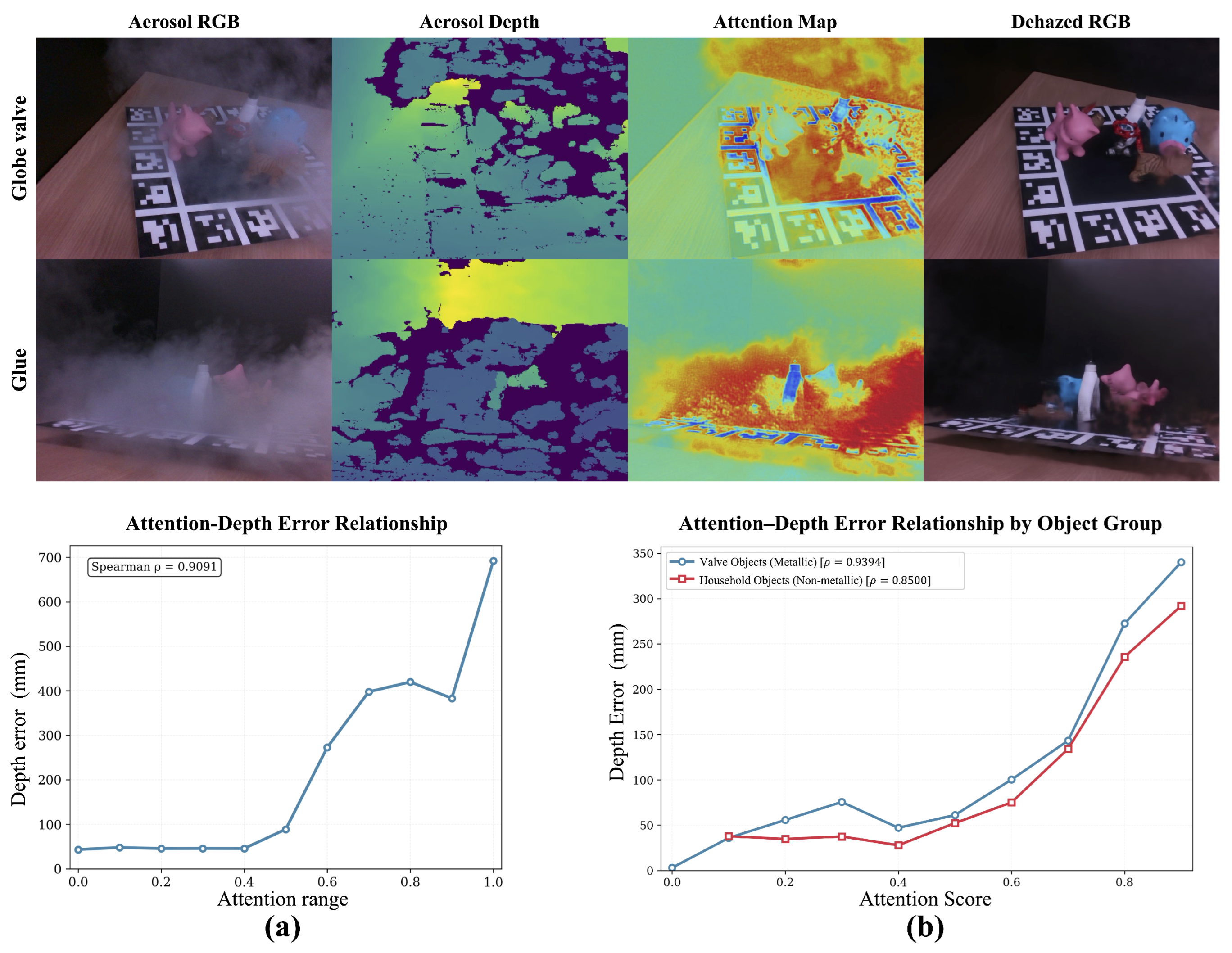 19] establishes that aerosol concentration is related to color attenuation, and the dehazing module learns attention maps based on this luminance deviation to identify degraded regions. Since RGB and depth sensors capture the same scene through the same aerosol medium, regions with high aerosol concentration exhibit both RGB degradation and depth measurement errors. Thus, the attention map not only aids RGB restoration but also serves as a depth reliability indicator. We empirically validate this relationship in
