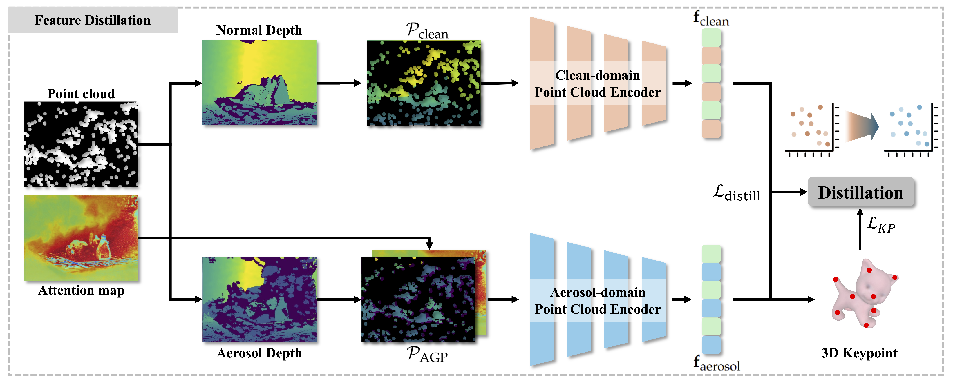 Unlike conventional preprocessing-based dehazing, our method quantifies depth reliability through the dehazing attention map and integrates it as an additional channel in the point cloud. The key idea is that attention values indicate the degree of aerosol degradation: higher attention values signify severe aerosol degradation in the region and low reliability of depth information. This AGP enables adaptive learning for spatially non-uniform aerosol distributions. The feature distillation process utilizes this quantified attention information as spatial weights. In heavily degraded regions, we leverage more discriminative representations from the clean network, while in less degraded regions, we utilize the aerosol network’s own learning capability, enabling adaptive learning for such environments.