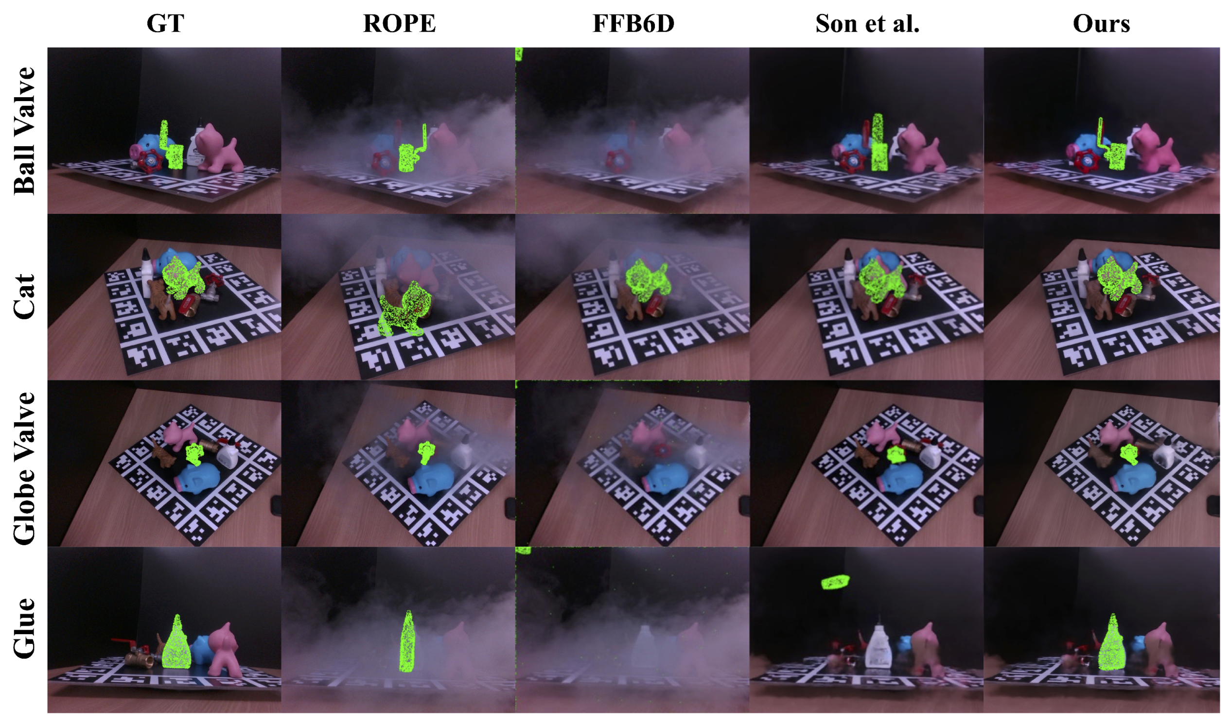 Table 1 compares accuracies under normal and aerosol conditions. Under normal conditions, RGB-D-based FFB6D achieves 69.4% average accuracy, significantly outperforming RGB-only ROPE 52.2%. While ROPE is designed as an occlusion-robust RGB-based method, it shows limited performance compared with RGB-D approaches due to the absence of depth information, demonstrating the critical role of geometric depth in accurate pose estimation. Under aerosol conditions, all methods experience significant performance degradation. RGB-only ROPE drops sharply to 20.8% (−31.4%), while FFB6D decreases to 27.9% (−41.5%). Interestingly, FFB6D shows greater degradation than ROPE despite using depth information, which indicates that severely degraded depth sensors in aerosol environments produce noisy depth that negatively impacts network learning. Examining object-specific performance, Ball valve and globe Valve show the lowest accuracies of 12.5% and 11.2%, followed by Glue at 28.7%, while Cat stays at 59.5% due to rich textures, enabling sufficient feature extraction even from degraded RGB.