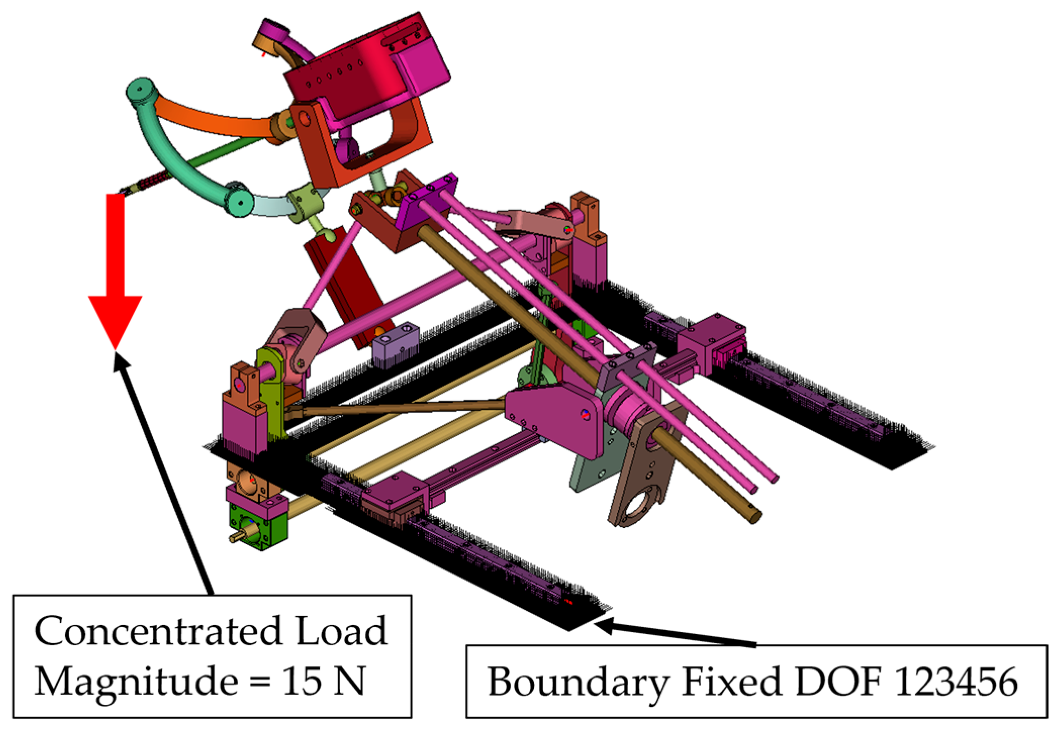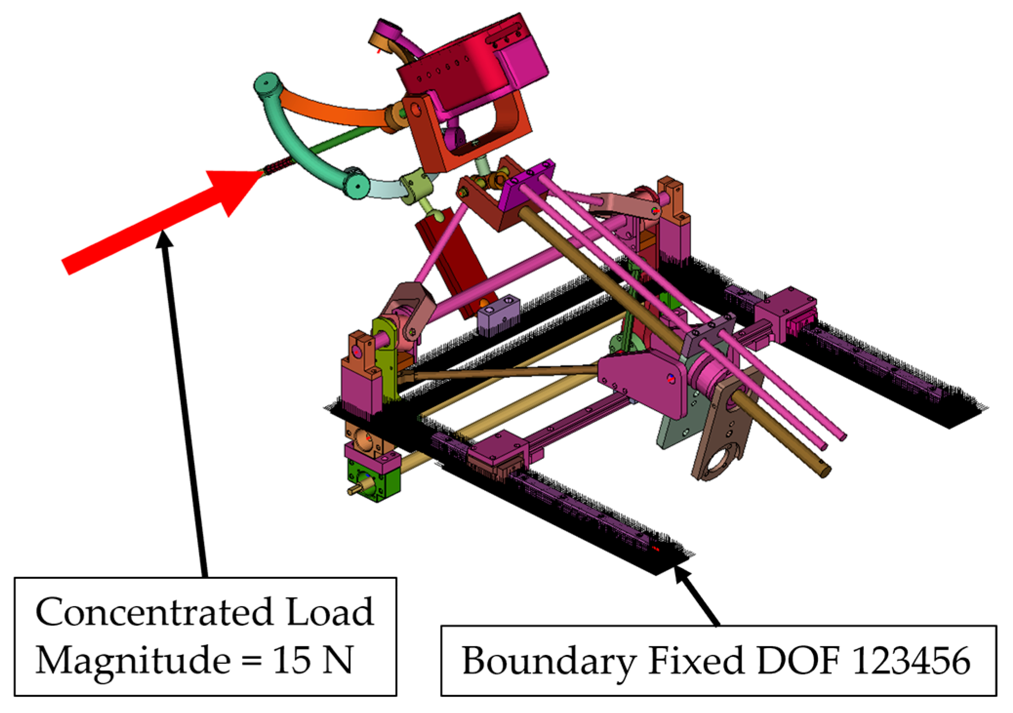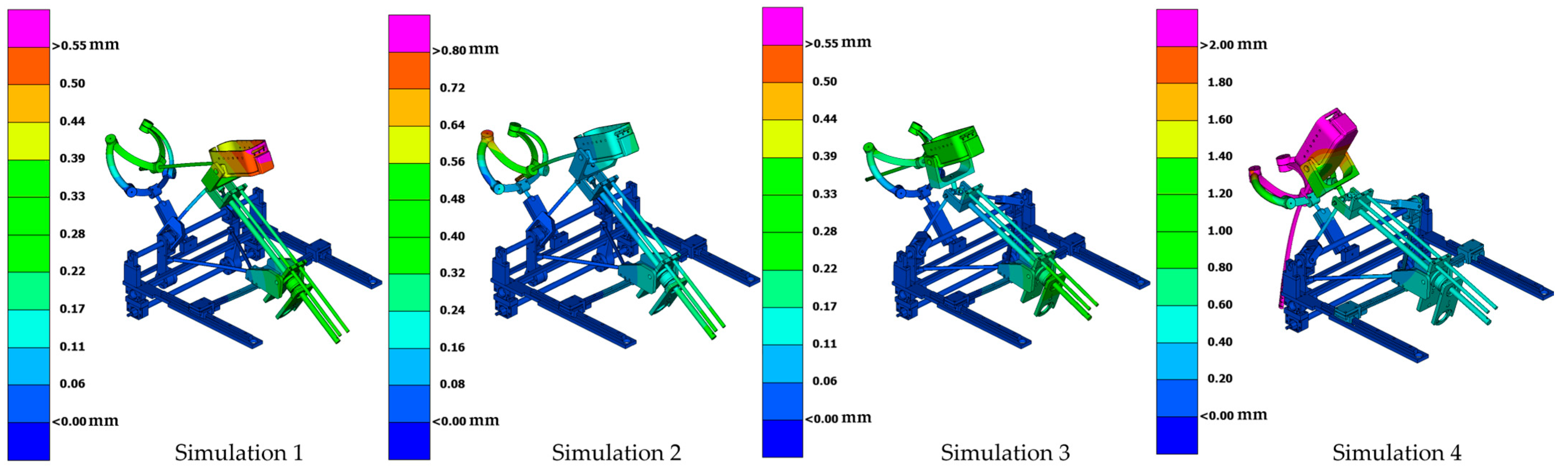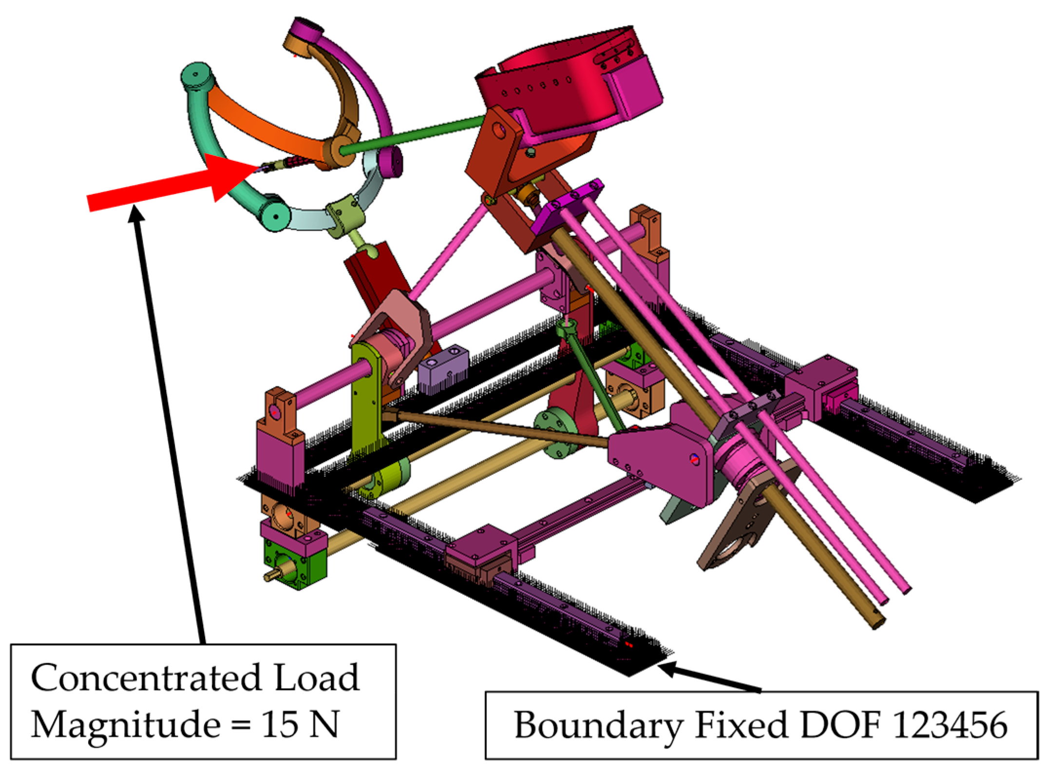 - Simulation 4: Robot in the maximum inserted position, with a load of 15 N applied along the global Z axis (gravity direction) (Figure 11).