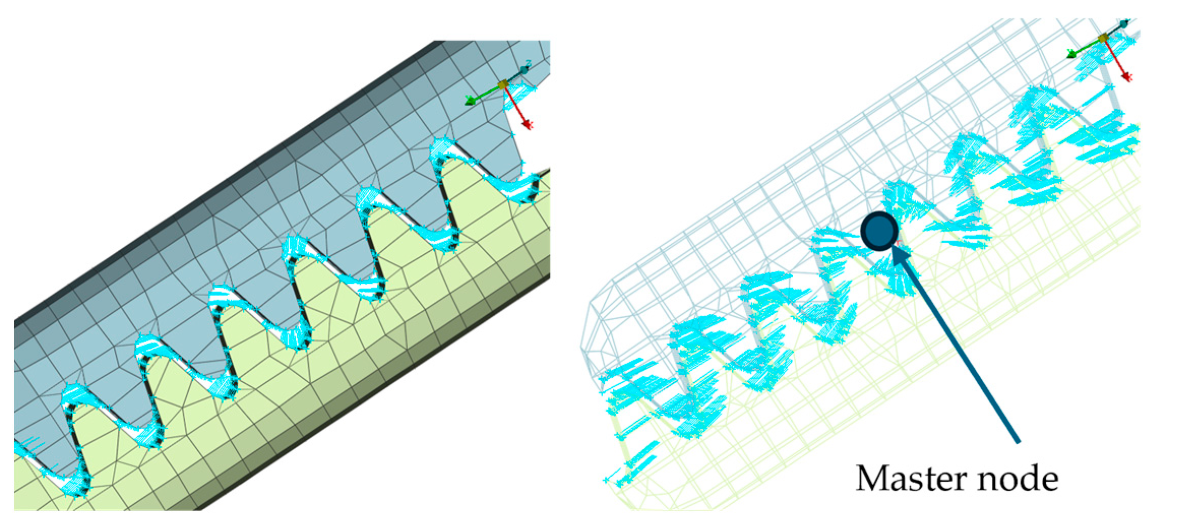 | Simulation | Displacement of the Master Node [mm] | Applied Force on the Master Node [N] | Calculated Stiffness (F/u) [N/mm] | Maximum von Mises Stress [MPa] |