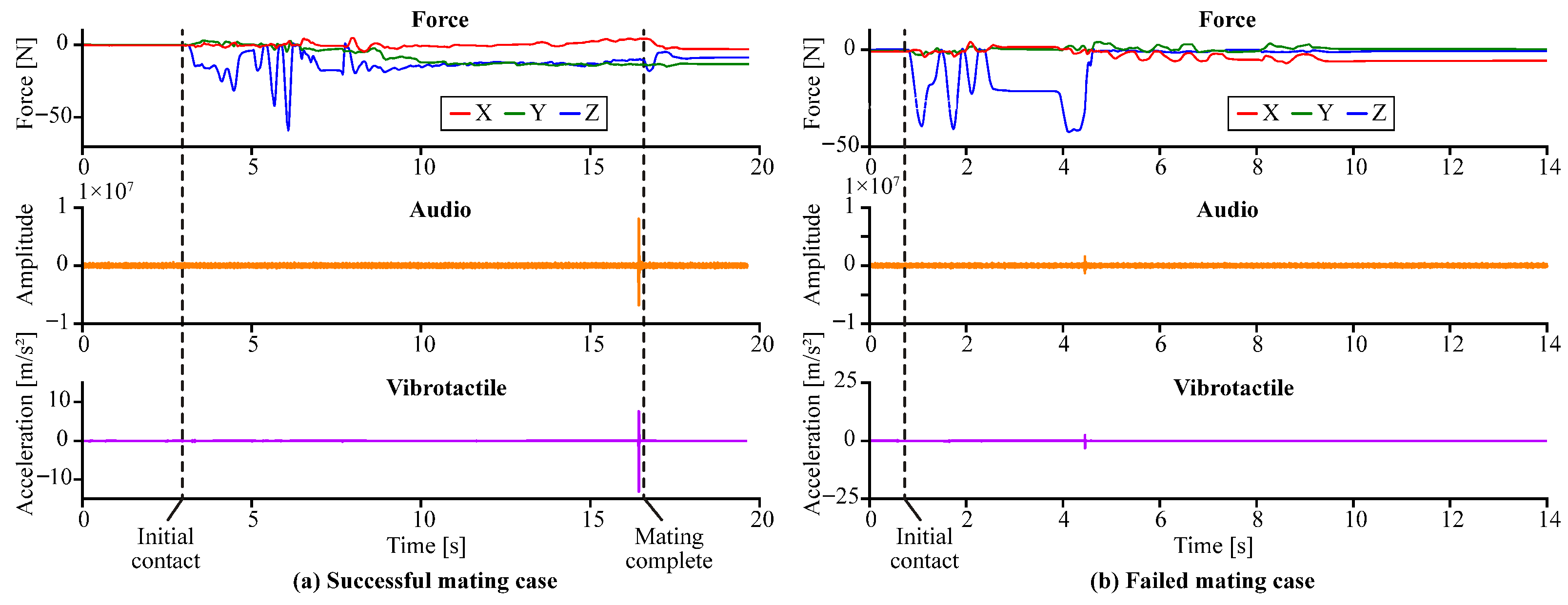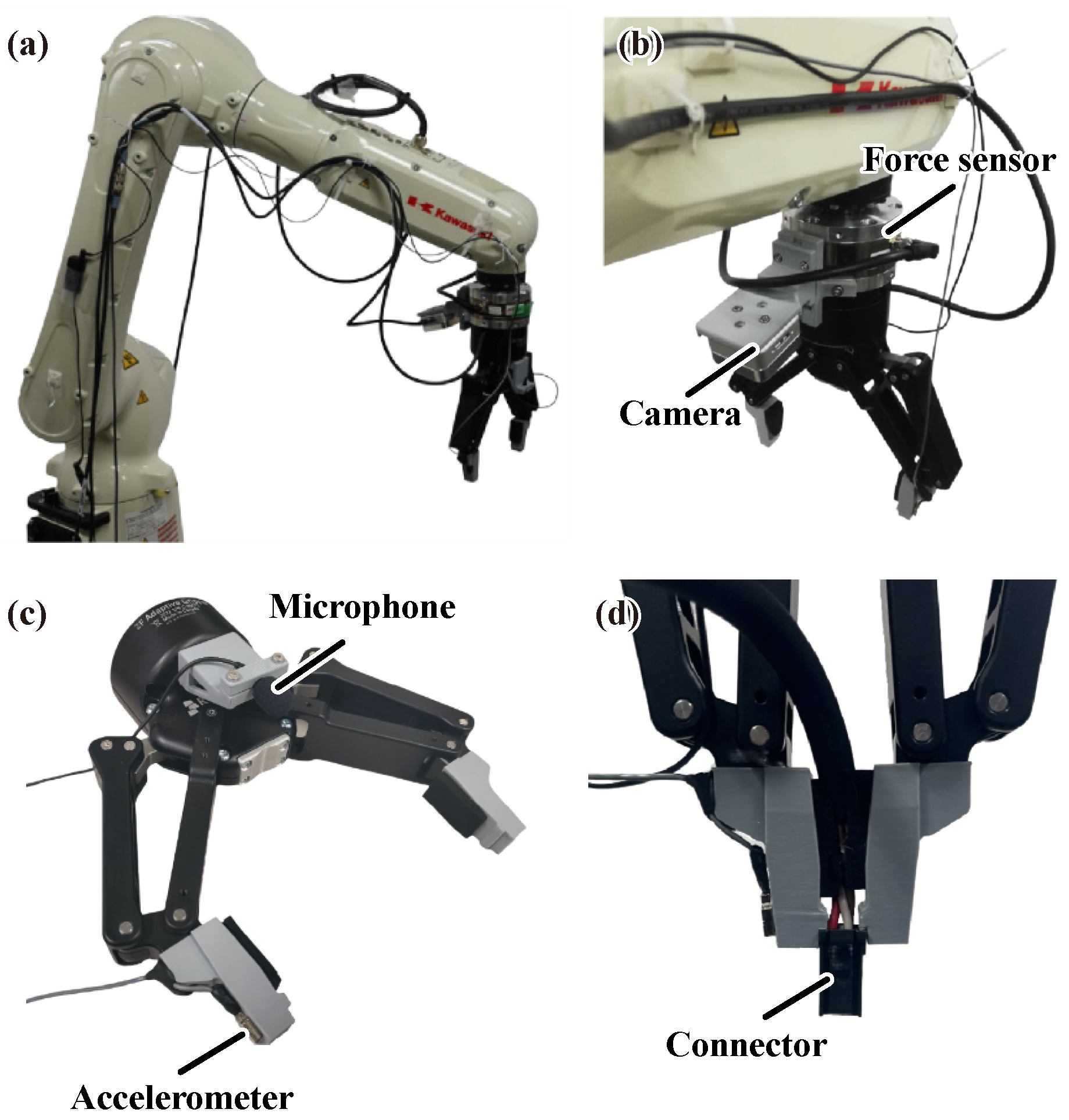- Vibrotactile: A high-bandwidth accelerometer (VS-BV20, TOKIN Corporation, Miyagi, Japan) was attached to a gripper finger to capture high-frequency transients during connector mating.