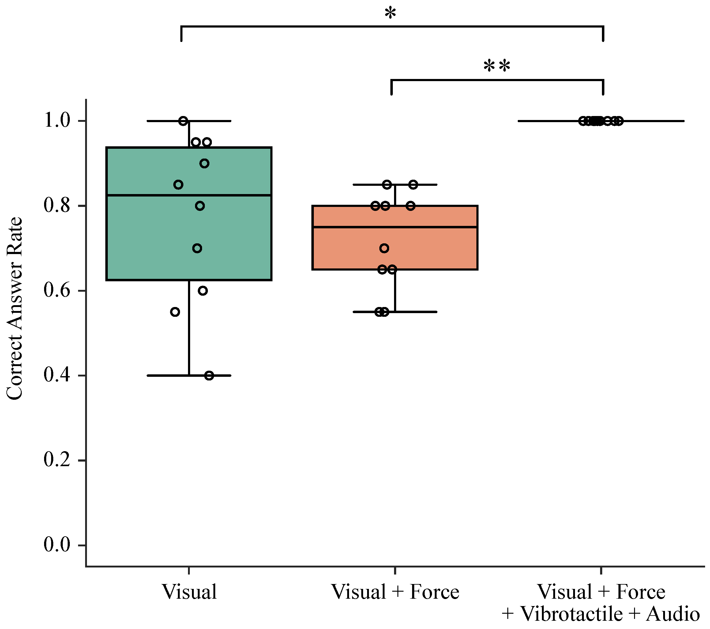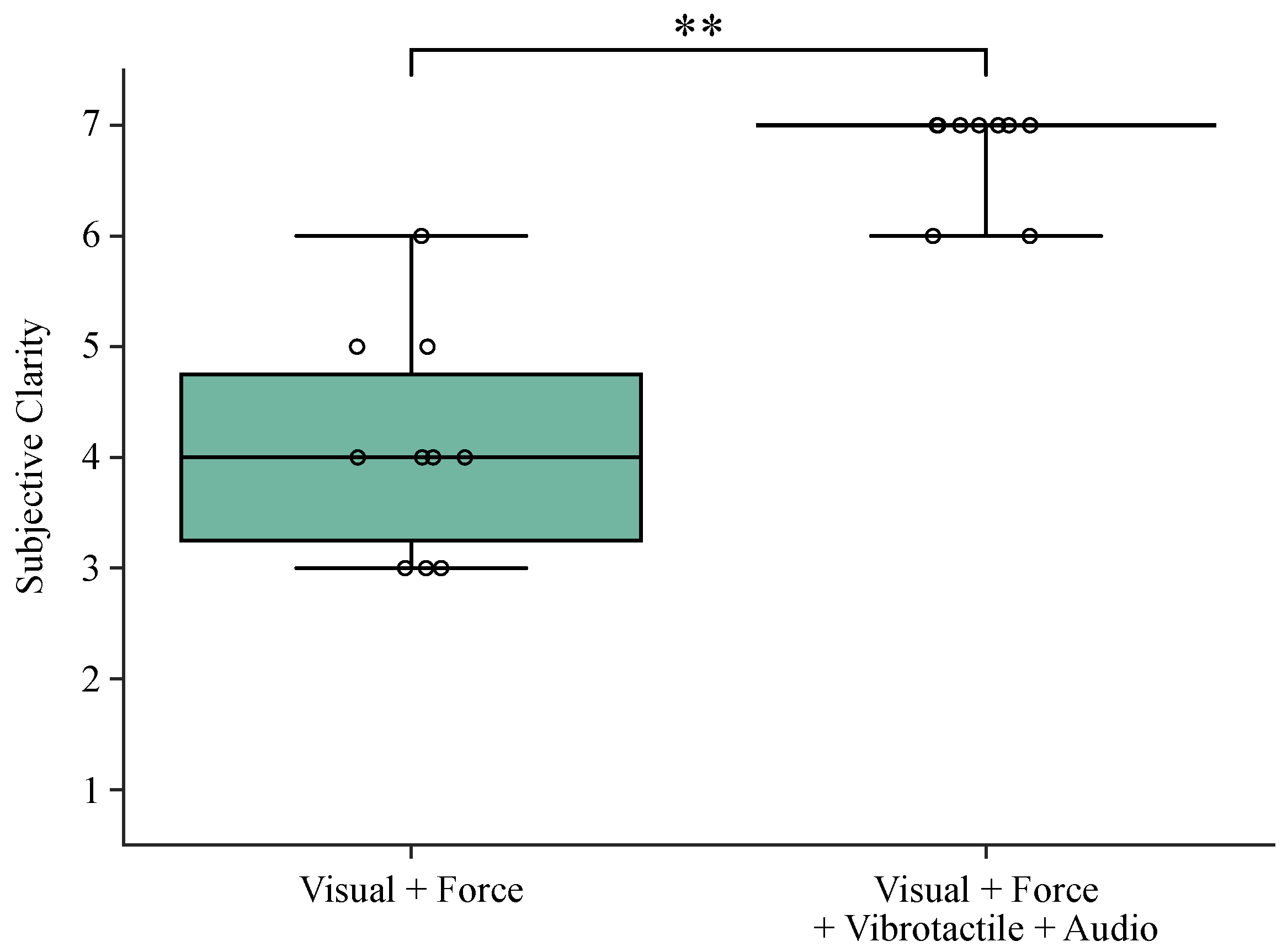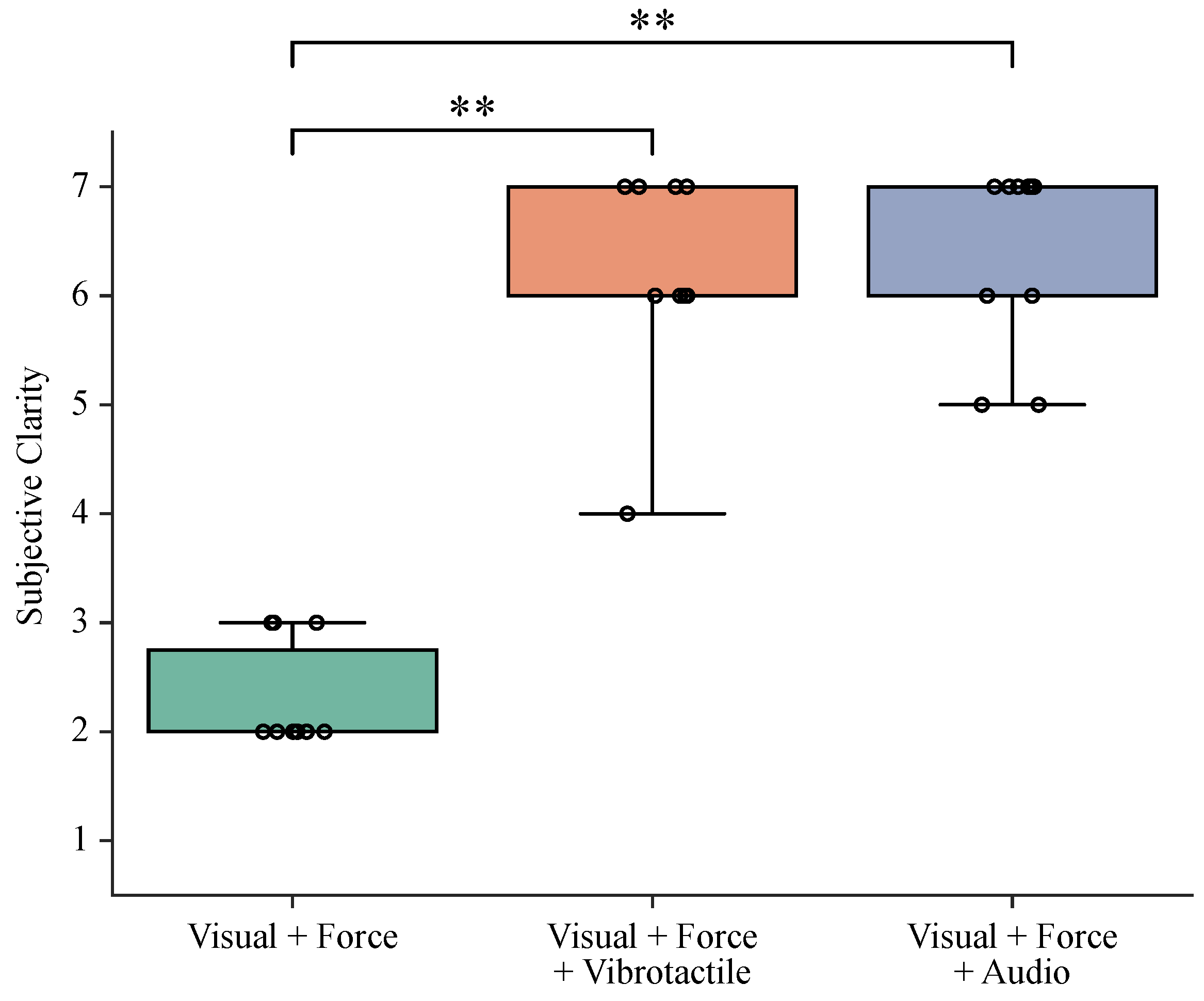 - Performance and Clarity: The addition of vibrotactile and auditory cues significantly improves the accuracy and subjective clarity of mating detection compared to visual and force feedback alone.
