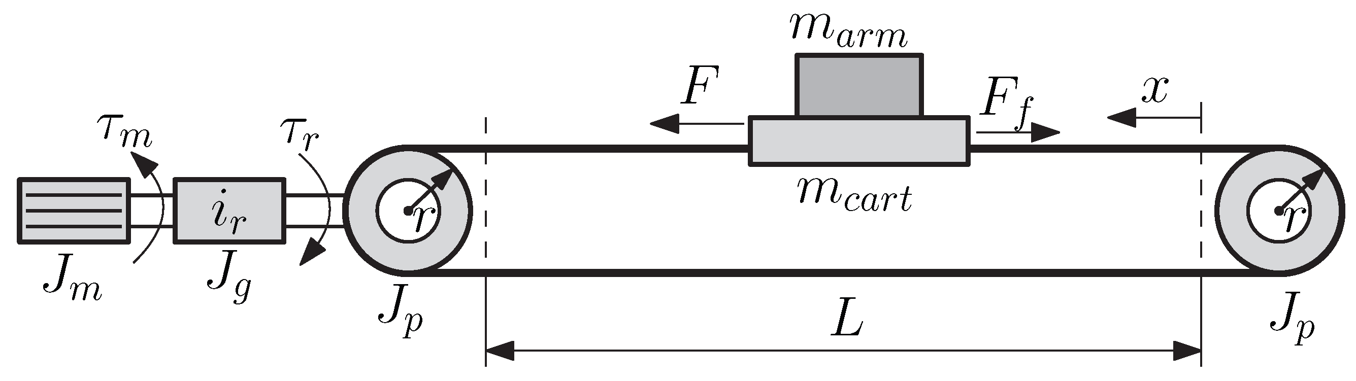 represent the inertia of the motor, gearbox, and pulleys, respectively. The parameter