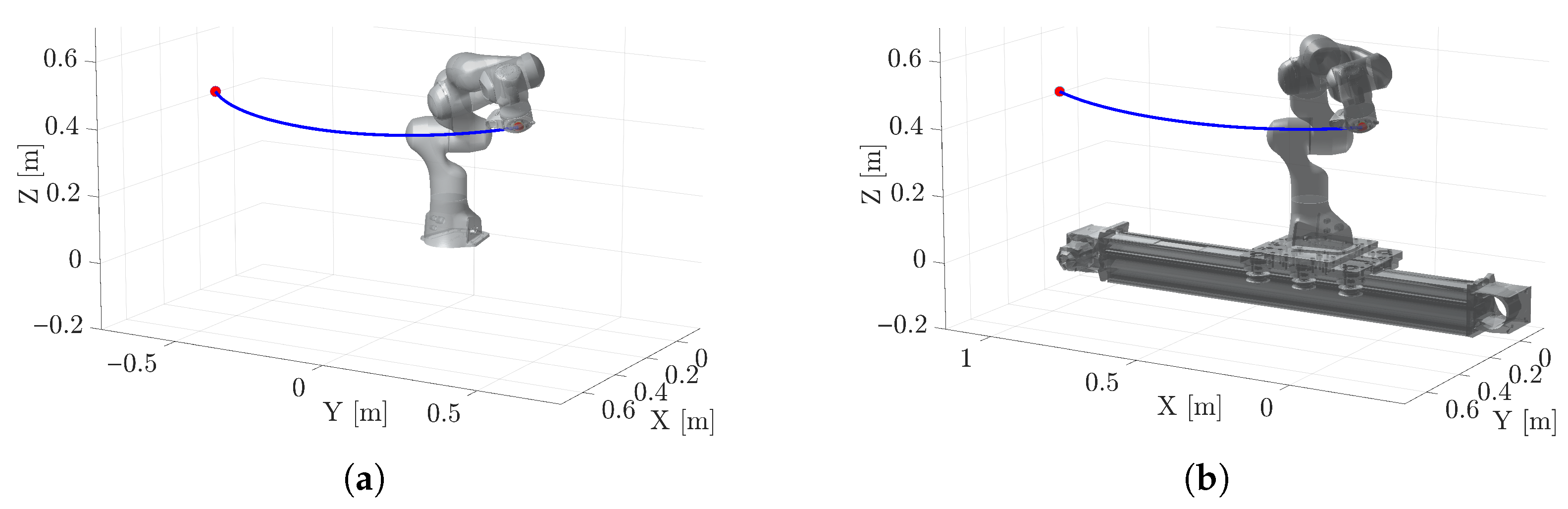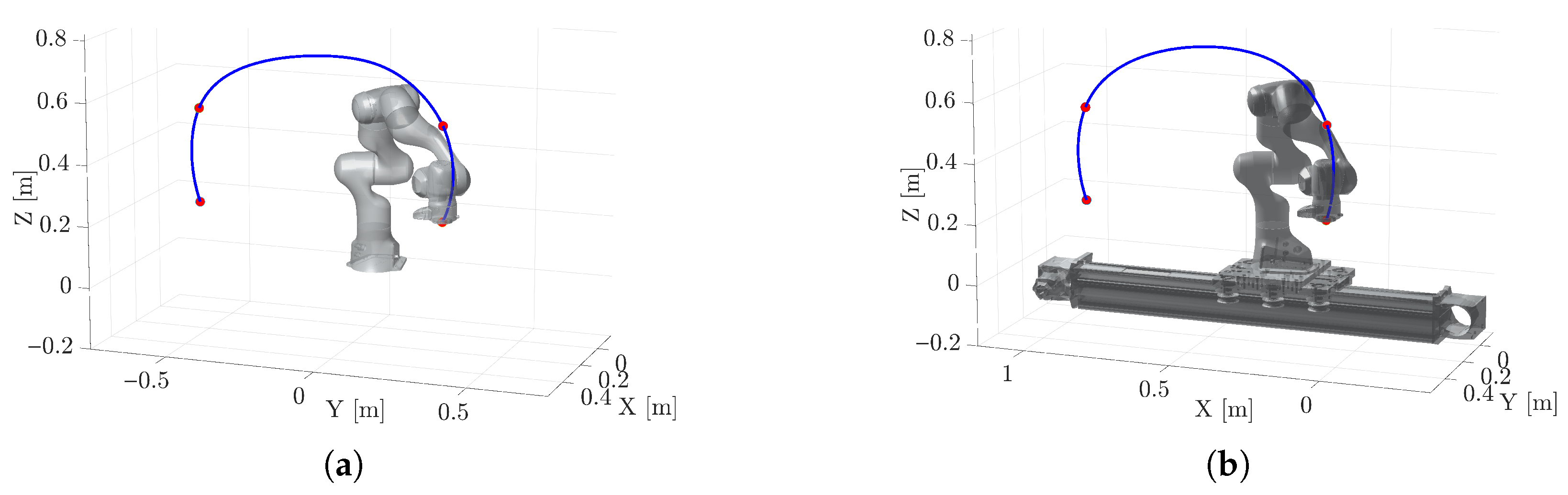 T = 2.5 s. The trajectory is planned using a fifth-degree polynomial motion law in the joint space. The position of the waypoints of Test A for the two considered robotic systems with respect to their base reference frame are reported in