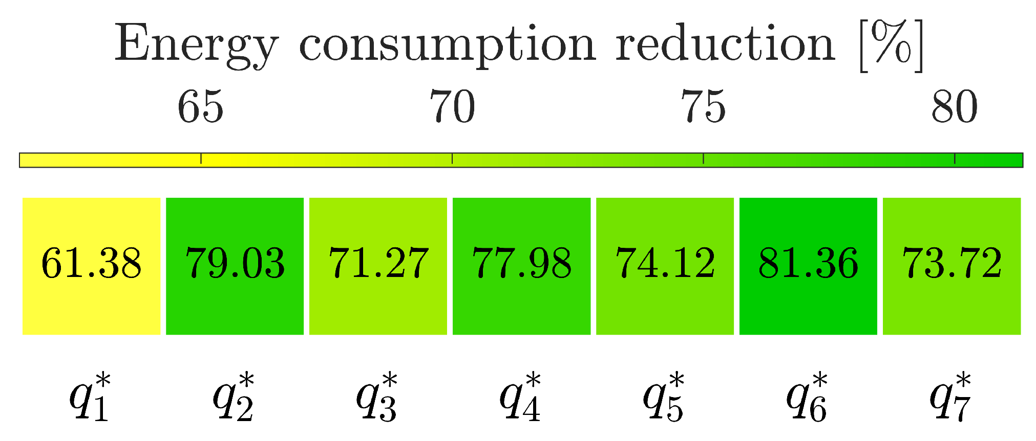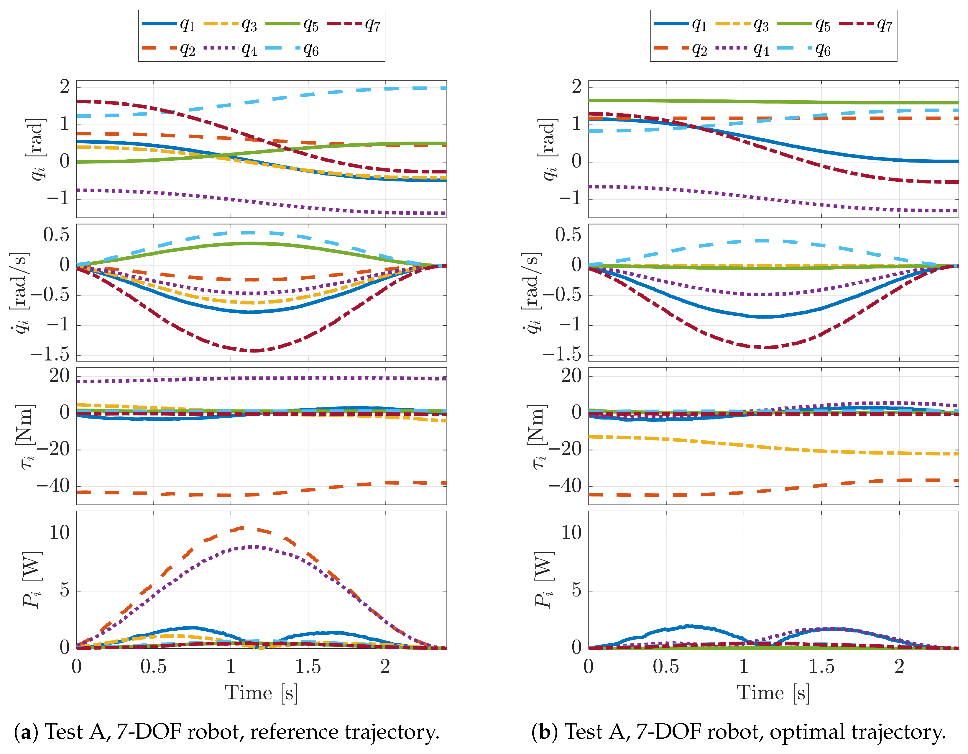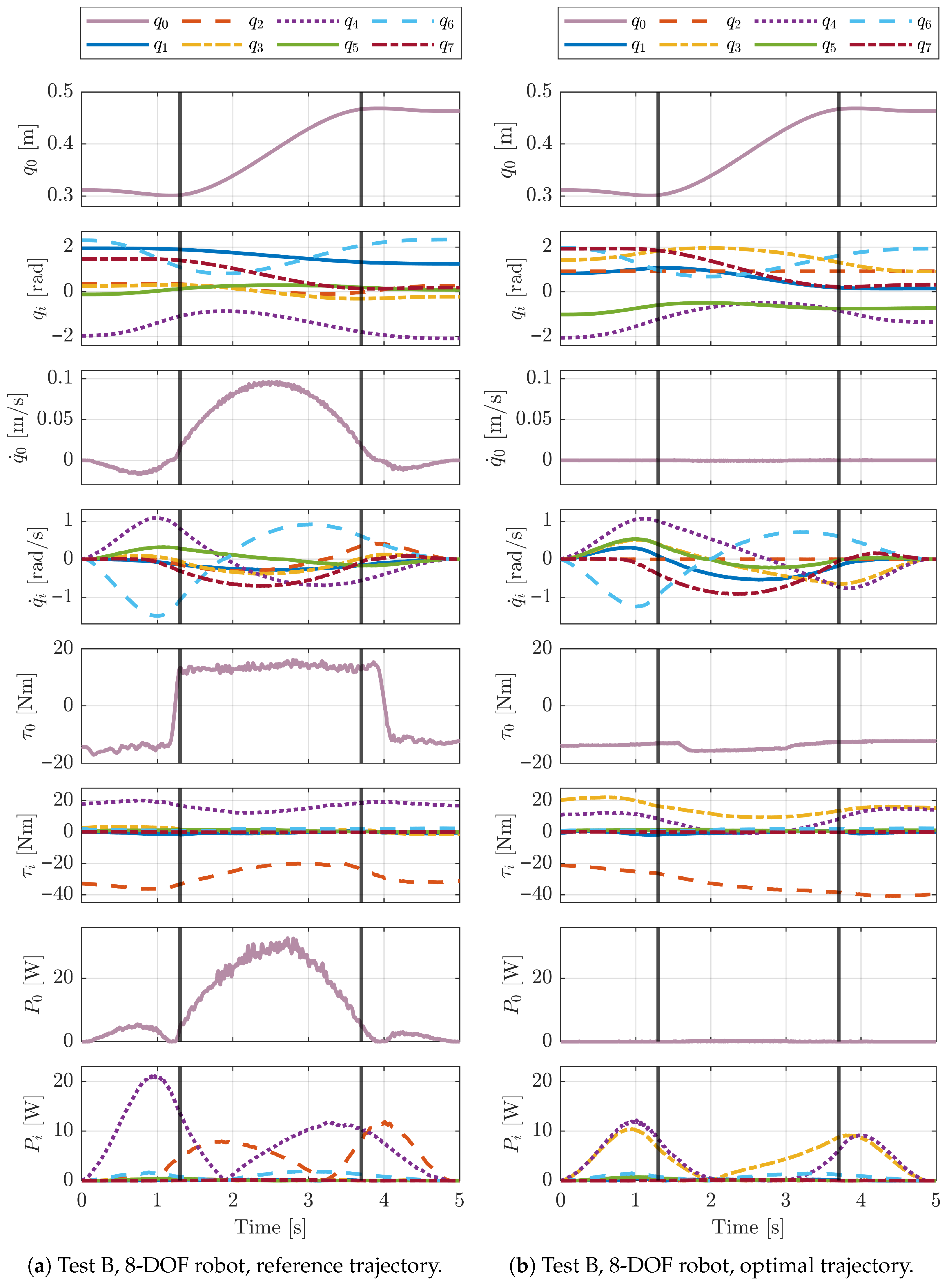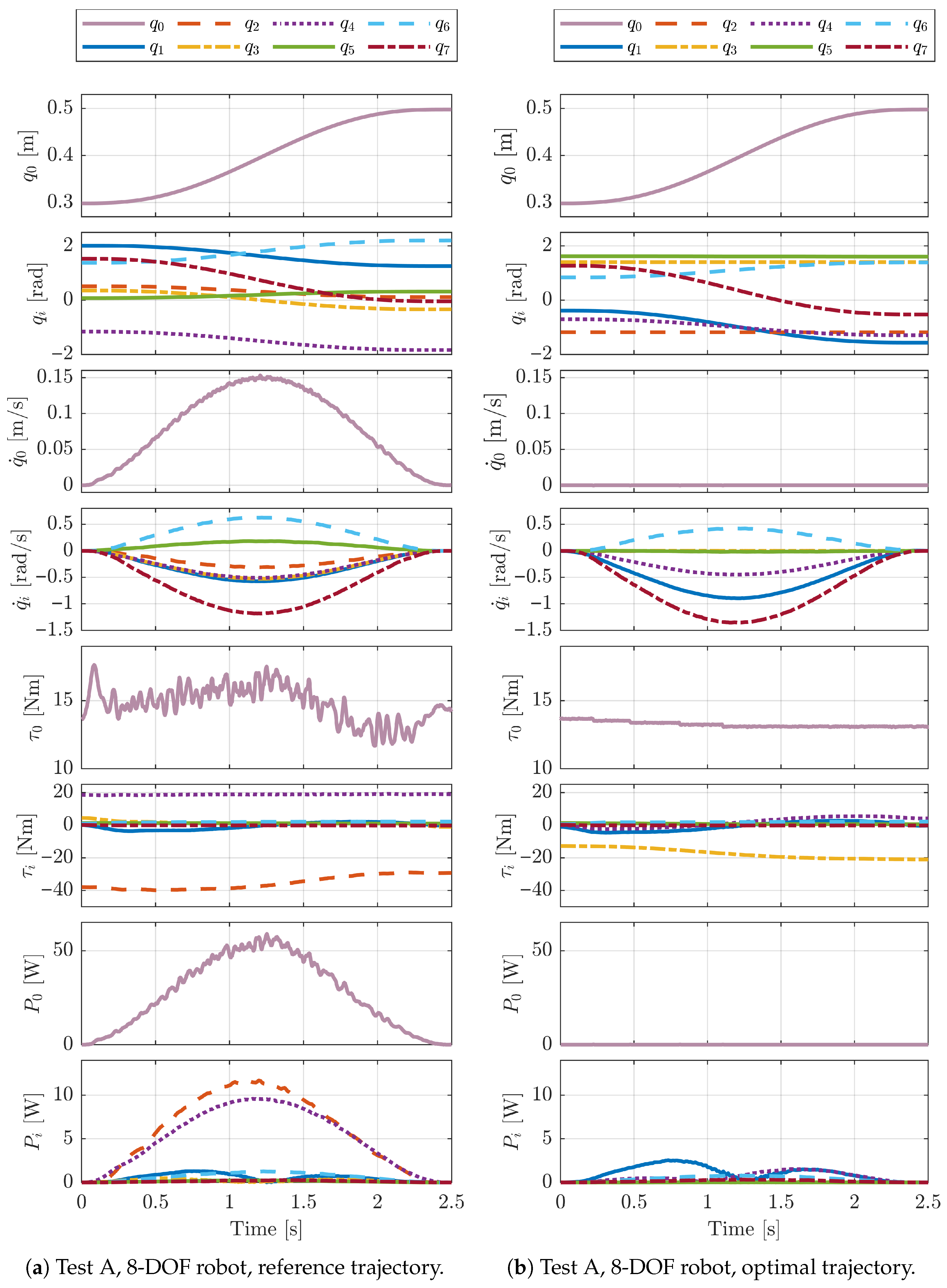 For each test and each case study, we define a reference case with respect to which the energy consumption reduction is computed. The reference cases are defined by selecting for each waypoint the solution of the inverse kinematics closest to a homing position. The joint positions in the homing configurations for both considered robotic systems are reported in