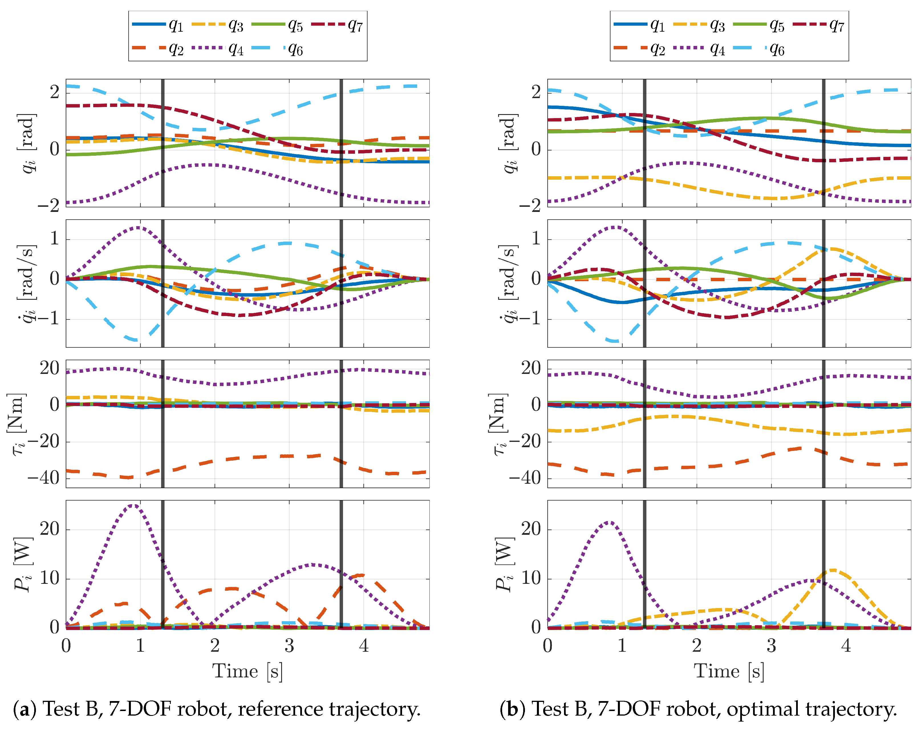 E accounts for the total mechanical energy required by the robot to execute the desired motion, including the energy needed during both the acceleration and deceleration phases. In this work, regenerative effects and energy recovery during braking phases are not considered. This choice is motivated by the fact that the majority of industrial robots are not equipped with power regeneration systems and, therefore, cannot recover braking energy, which is instead dissipated as heat on a resistor.