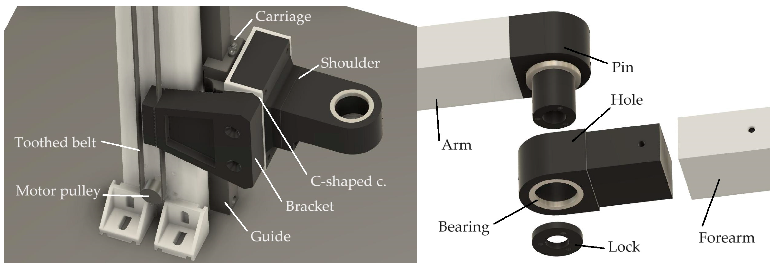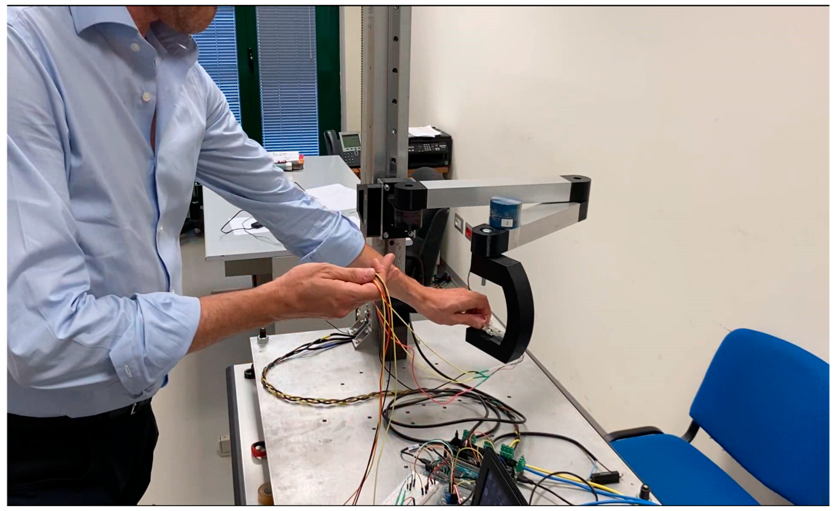 - Durante, F.; Raparelli, T.; Zobel, P.B. Development of a 4-DoF Active Upper Limb Orthosis. Robotics 2022, 11, 122. [Google Scholar] [CrossRef]