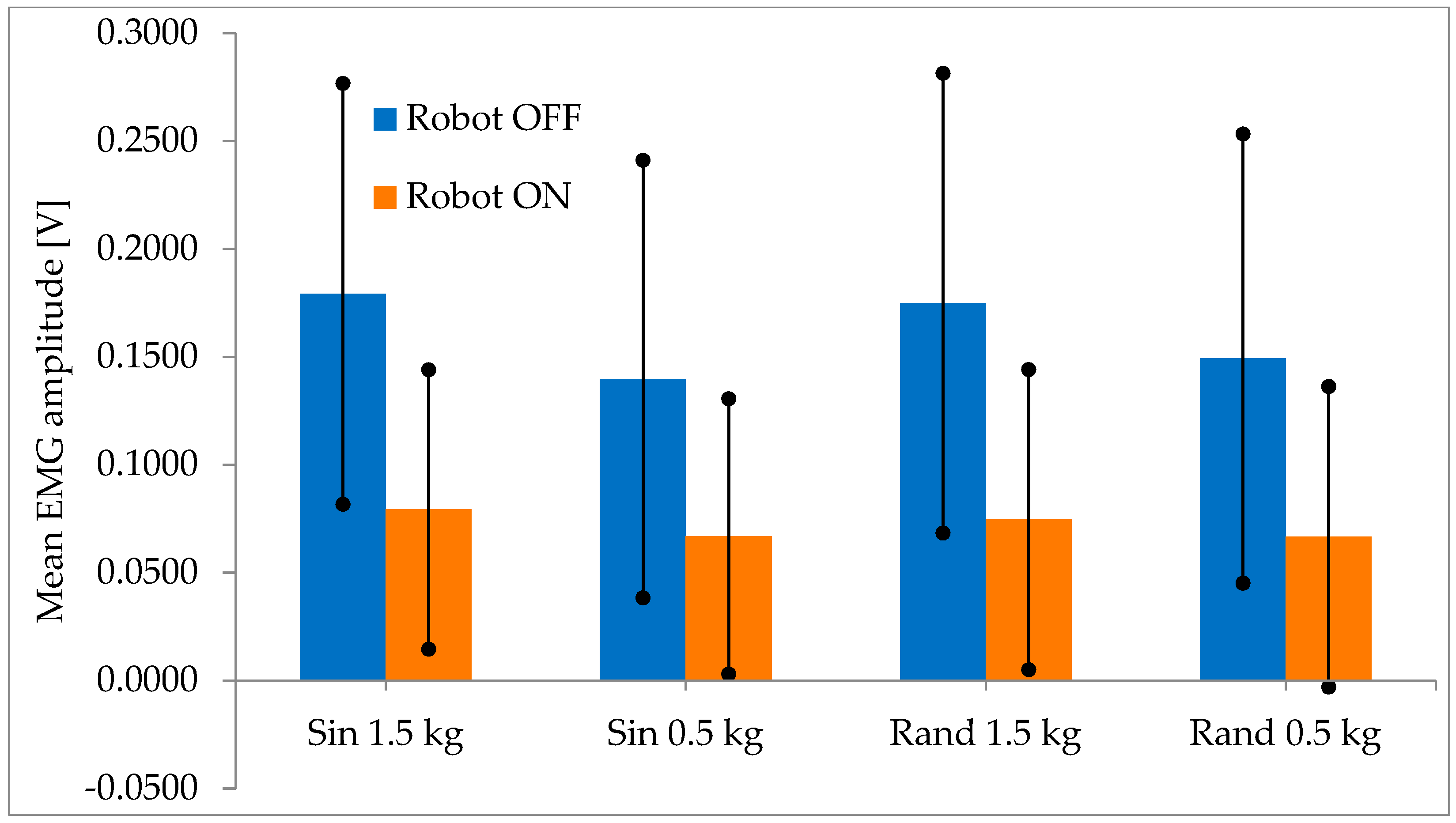 | Ref. Signal | Load (kg) | , Robot ON (%) | Δe_med (%) | EMG Reduction (%) |