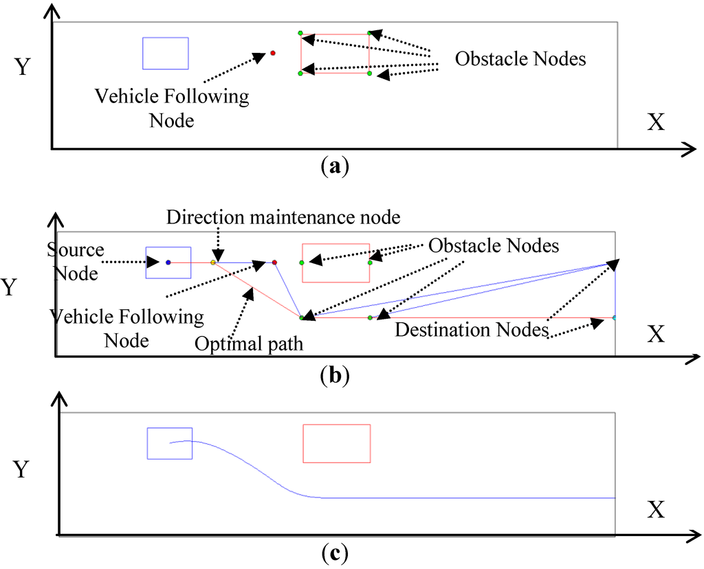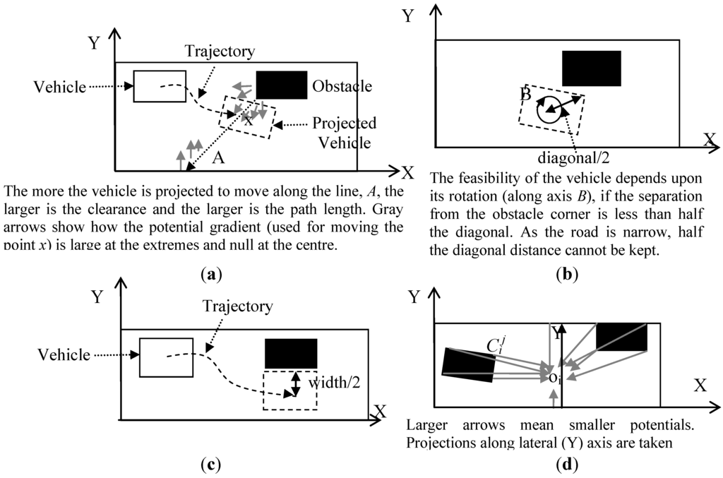, each of which repels the node by a magnitude inversely proportional to the square of the distance. The road boundaries also act as obstacles and repel the node. The repulsion is, however, proportional to the shortest distance between the vehicle and the road boundaries. The resultant potential is given by Equation (3).