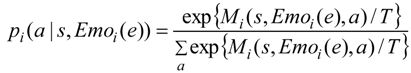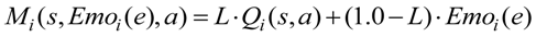 - Observe the state si ∈ S of the environment, judge the situation ei ∈ E if the goal or other agents appear in perceivable area, calculate emotion Emoi(e) and motivation Mi(s, Emoi(e), a) at the state si and situation ei of each selectable actions, select an action ai ∈ A according to the stochastic policy (Equation (8)).