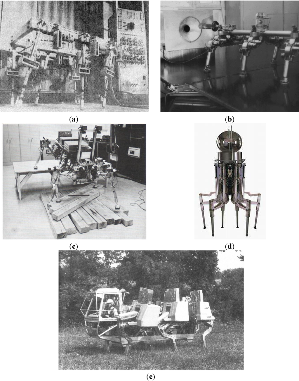Early hexapod design: (a) University of Rome’s hexapod; (b) MASHA hexapod; (c) OSU hexapod; (d) ODEX I hexapod; (e) ASV hexapod.