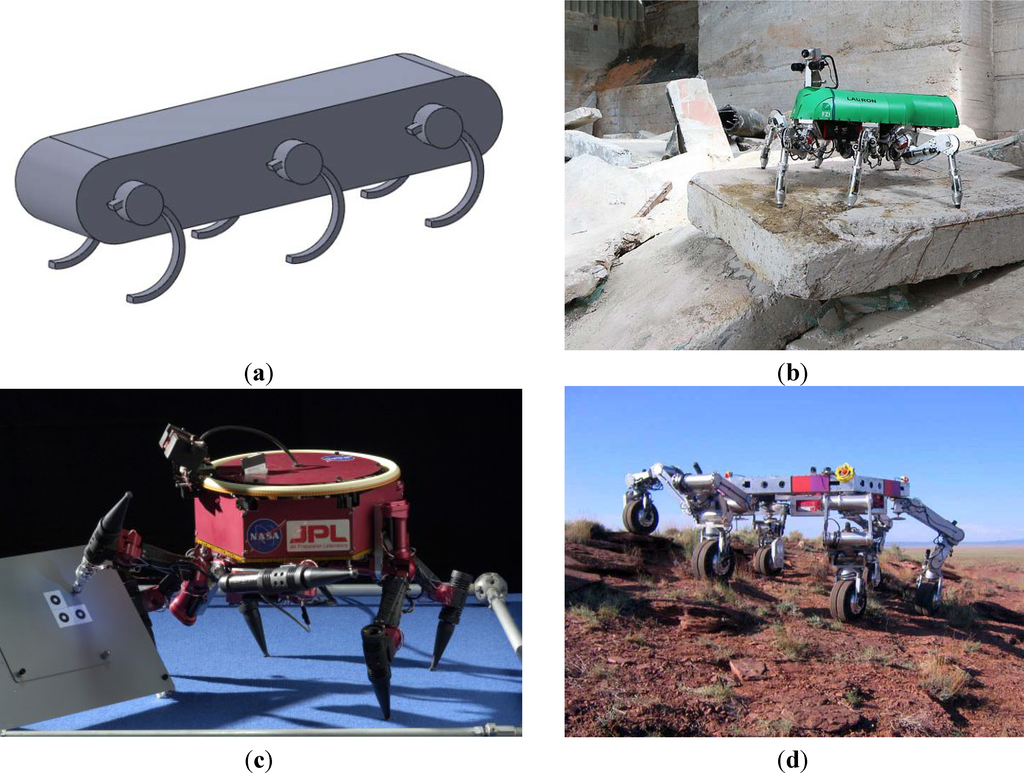 Recent developments in hexapod design: (a) RHex basic architecture; (b) Six-legged walking robot LAURON V from the FZI Research Center for Information Technology in Karlsruhe, Germany; (c) One configuration of the LEMUR prototype: the front limbs function as legs and arms, with integrated tools; (d) ATHLETE during experimental tests.
