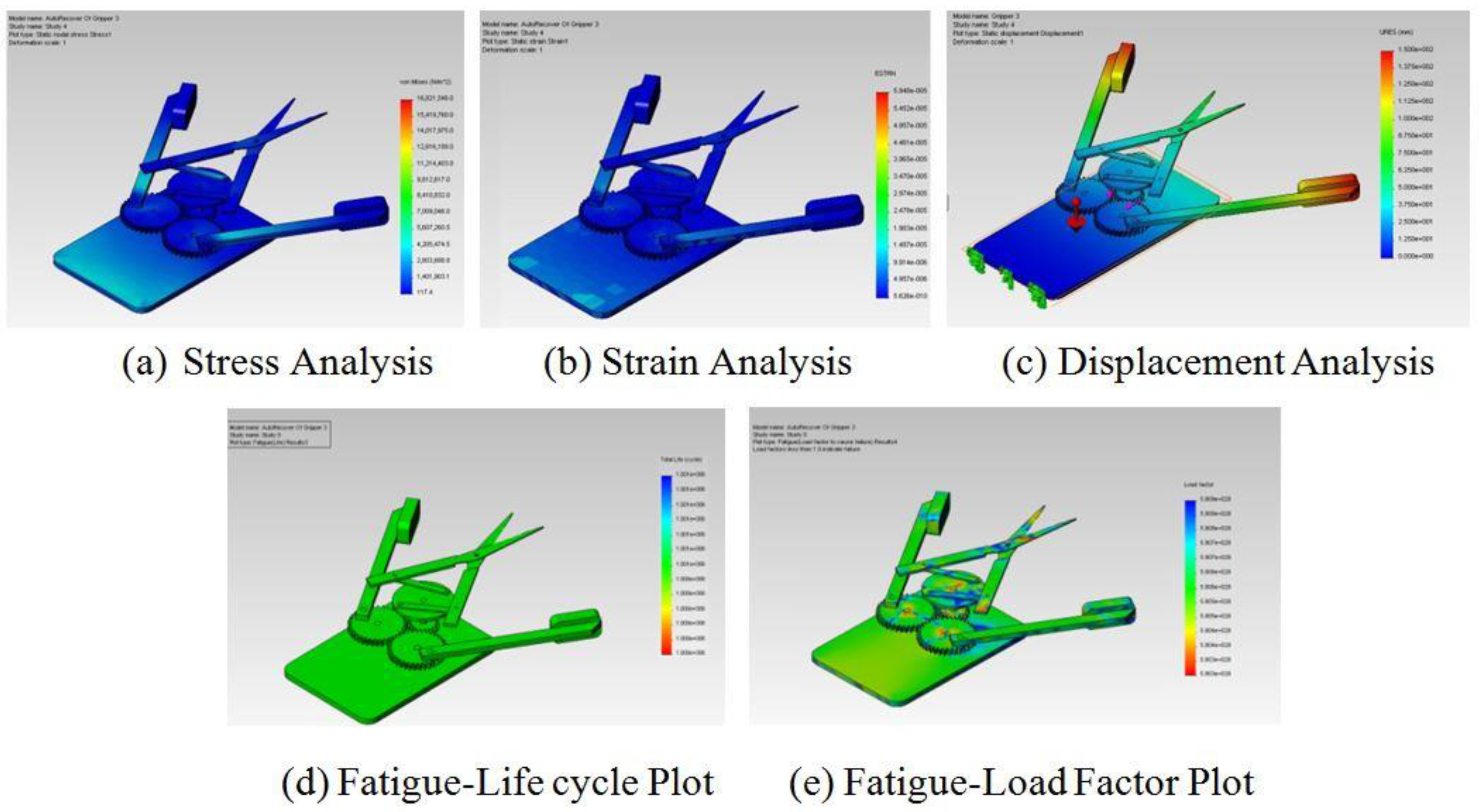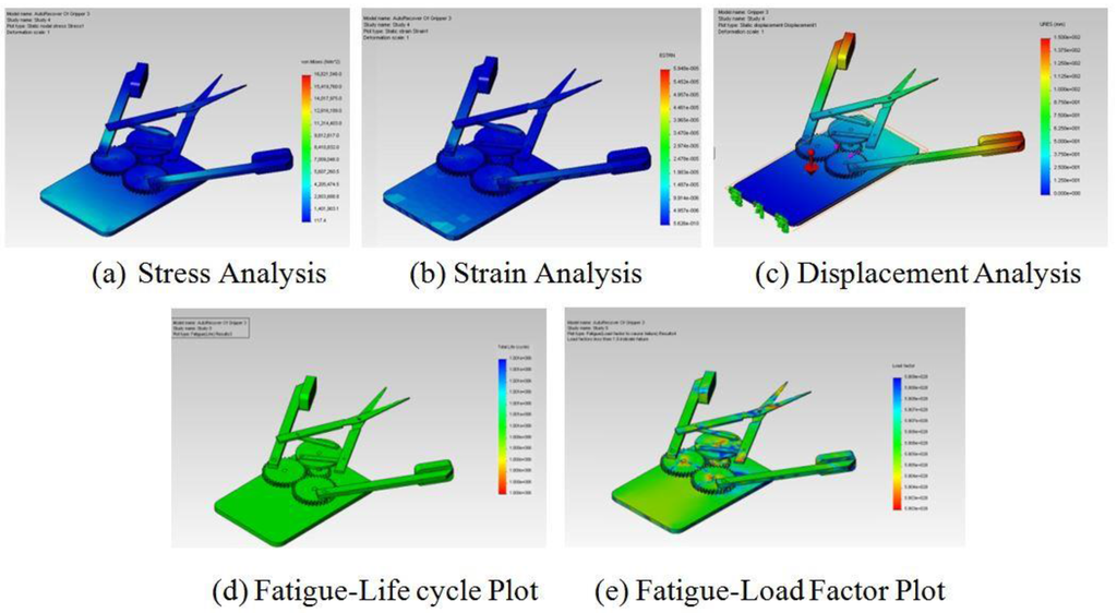 After determining the gripping and manipulation strategies, it is always important to determine the interactive factors and design parameters relevant to the strategies and desired gripping application. All the possible interactive factors and input parameters relevant to gripper design need to be framed together which provides the steps to obtain the optimal gripper design. The factors that significantly influence the gripper selection were given by Monkman, et al. [26], such as the robot and machine system, position of components in installation/equipment, size and shape, mass and properties, motion sequence, velocity and acceleration, forces acting on gripper during motion, grasping points, gripper drive parameters, etc., in which the crucial conditions for not only dynamic but also static components are interconnected with the optimal gripper design. After deciding on the important parameters and primitive design, it is always good to perform modeling and simulation of the design in appropriate 3D mechanical CAD software to verify the specified parameters and performance under a controlled environment. Edan et al. [27] reported a finite element modeling technique and optimization of modeling parameters for melon grippers while Bachche et al. [28] and Bachche and Oka [29] described the simulation and modeling methods using Solidworks for a sweet pepper harvesting robot hand (Figure 2). The modeling of the system provides all optimal parameters which can be used to build the prototype and improve on the system performance obtained in the simulation process. The simulation process helps to determine the static and fatigue characteristics and effectiveness of the system. In case of any failure within the system, a part of the system can be redesigned or material can be changed to obtain highly stable and efficient end-effector before the actual manufacturing process takes place. These techniques and methods always help to optimize the picking system parameters through several design studies and it is also possible to perform the motion analysis of the model without actually prototyping it. The final optimized parameters which interact with the environment can be used for prototyping which always saves time, manufacturing costs and complicated calculations. The static characteristics such as stress, strain and displacement analysis help to determine the performance of the system under a working environment while fatigue characteristics such as fatigue life cycle and fatigue load factor plots helps in determining the component analysis for better performance of the designed system.