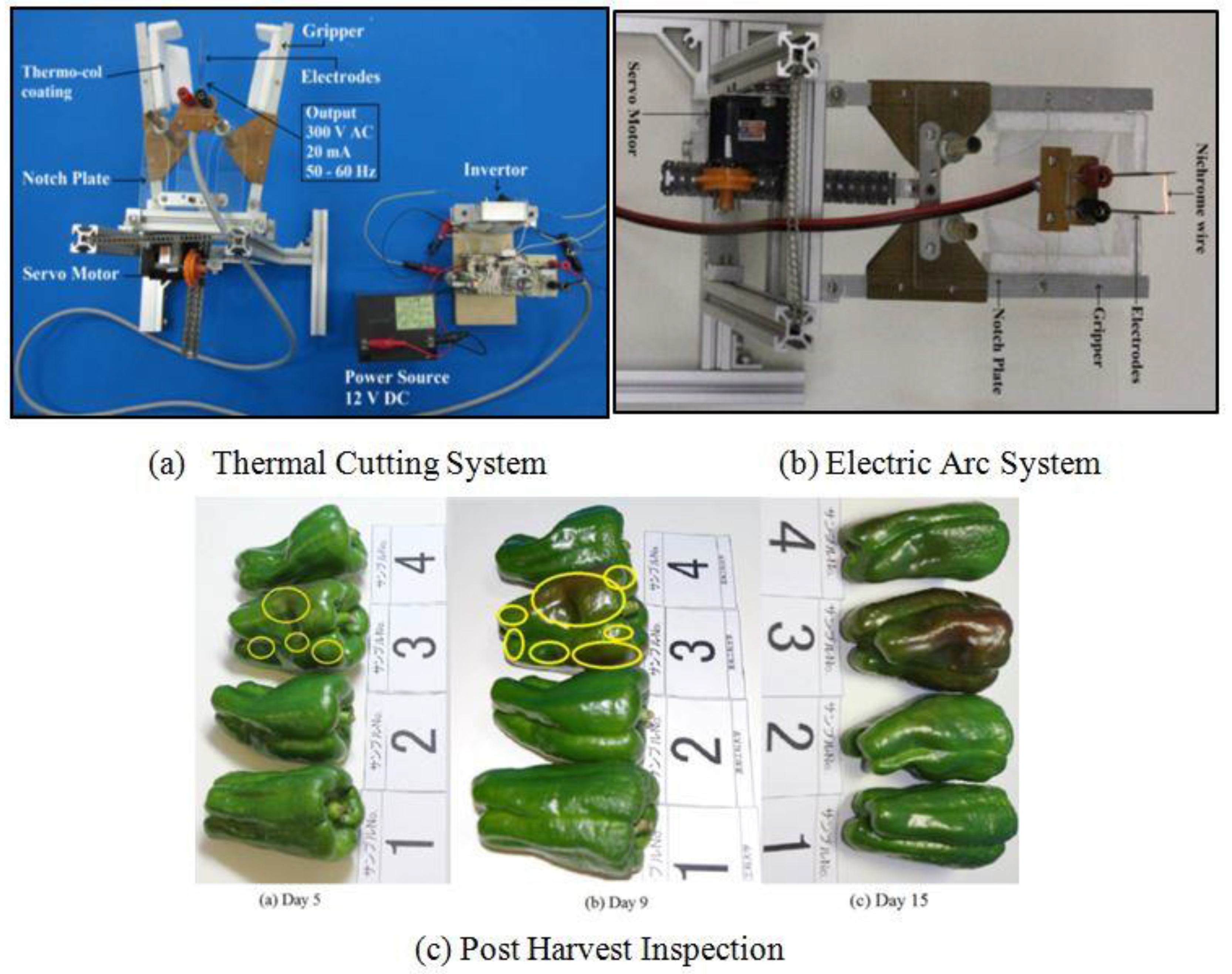 Bachche et al. [34], Bachche et al. [35] and Bachche and Oka [36] developed a thermal cutting system for sweet pepper harvesting robots based on current and voltage potentials (Figure 3). These systems assist to avoid virus transformation, reduce the fungal vulnerability and increase the shelf life of fruits by adopting a thermal cutting approach. The design consists of two parallel gripper bars mounted on a frame connected by a specially designed notch plate and operated by a servo motor. Based on voltage and current, two different types of thermal cutting system prototypes—electric arc and temperature arc—were developed. In electric arc, a special electric device was developed to obtain high voltage to perform the cutting operation. At higher voltage, electrodes generate thermal arc which help to cut the stem of sweet peppers. In temperature arc, Nichrome wire was mounted between two electrodes and current was provided directly to electrodes which results in generation of high temperature arc between two electrodes that help to perform cutting operation. These prototypes were tested for several variable field conditions in which temperature arc system was found to be effective and took 1.5 s to perform the cutting operation. The post-harvest inspection of harvested fruits confirmed an increase in the shelf life of fruits and prevention of fungal and virus transformation. The fruits harvested by the thermal arc cutting system can be preserved more than 15 days under normal room conditions.