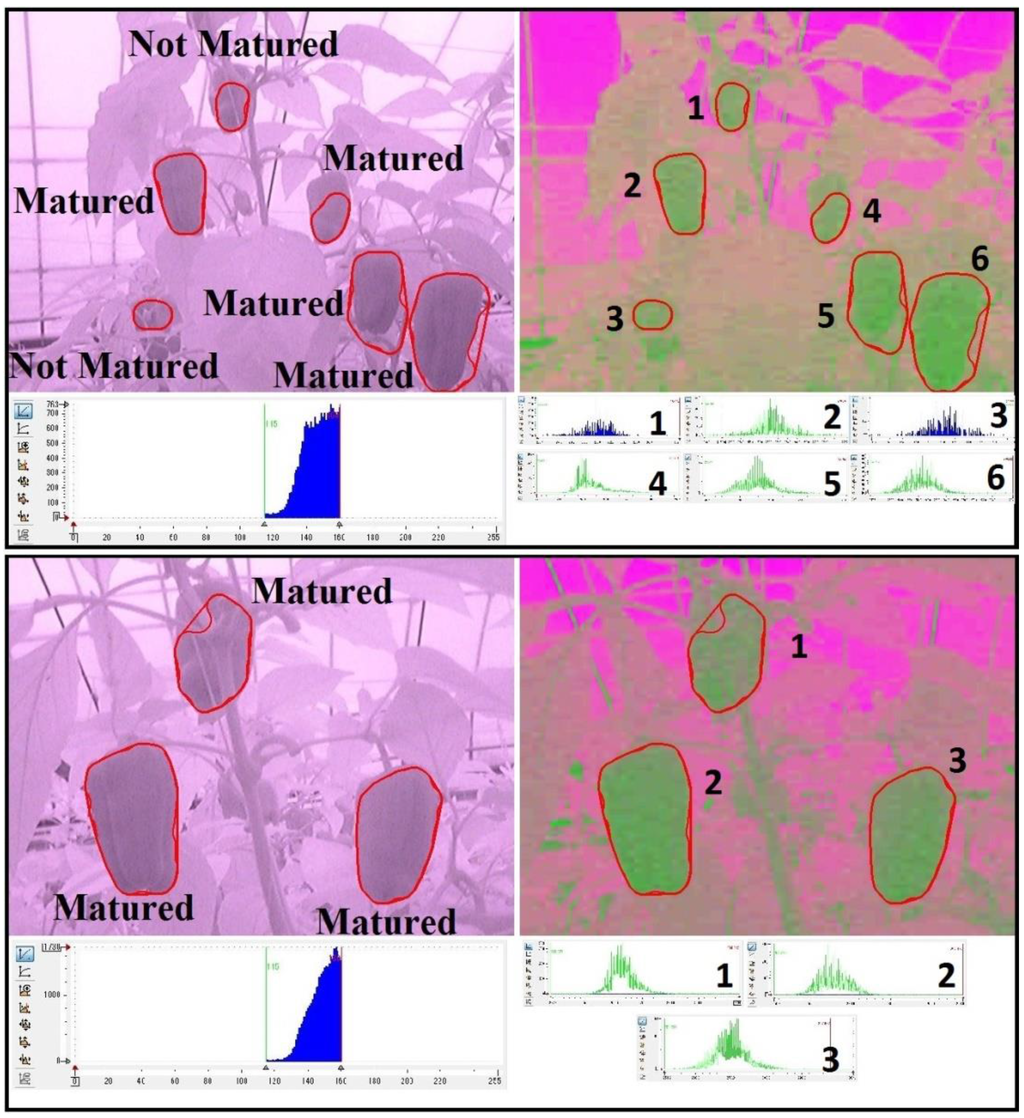 Results of multispectral recognition and maturity determination system [85]. (First image shows pre-known status of detected fruits while second image shows result image with histograms for maturity determination: green color—matured; other colors—not matured).
