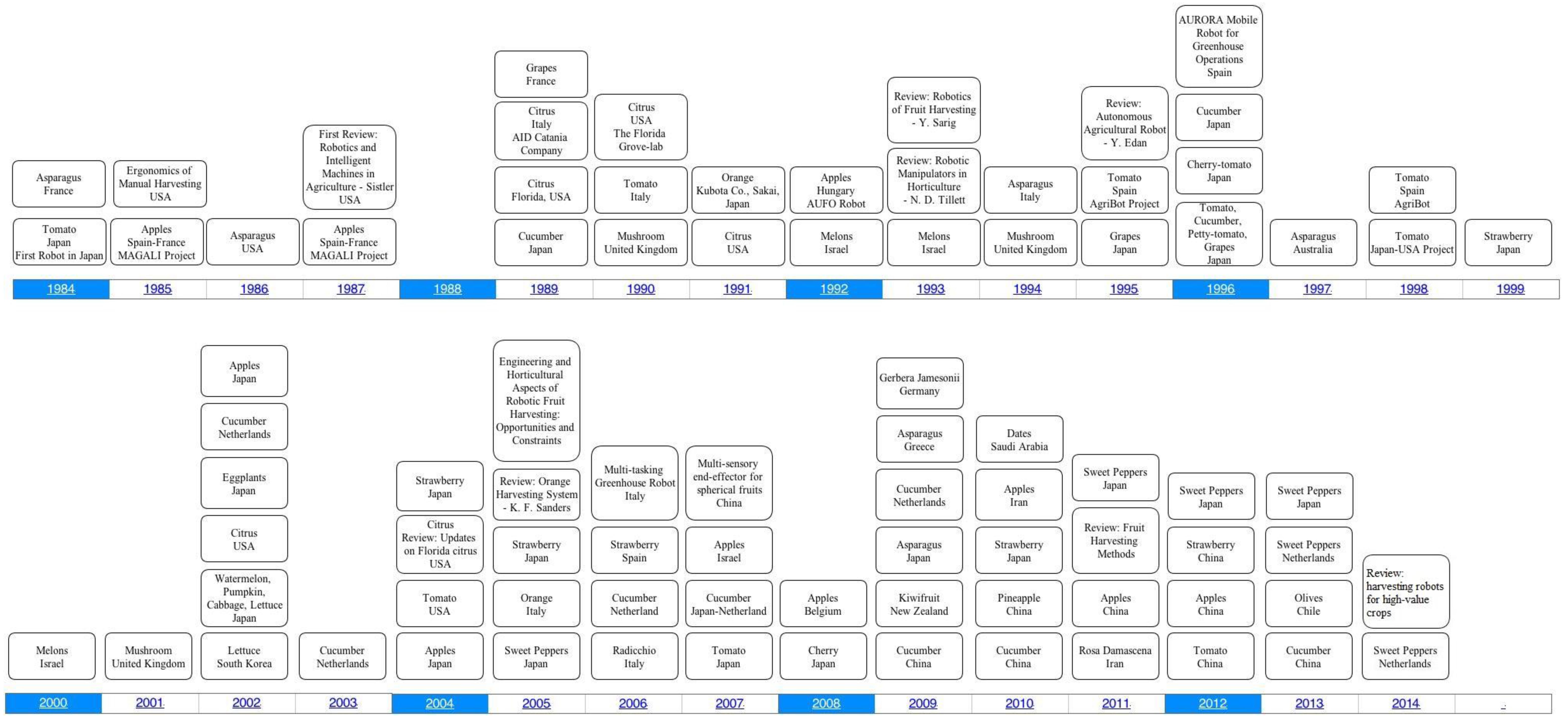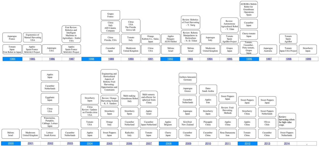 The timeline of development of fruit harvesting robots around the world can be seen in Figure 6 which shows the horticultural product and the country where it was developed. In the 90s, considerable work has been carried out in Japan and USA on fruit harvesting robots, while in the 21st century, many other countries also started to contribute to this field.