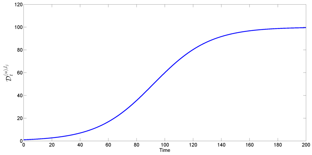 where λ is the unconstrained growth rate and K is the maximum carrying capacity of the environment. In other words, follows the standard logistic growth model with self-limiting growth. Because Equation (3) is deterministic, the entire resource evolution can be conveniently computed in advance, assuming that the parameters λ and K in this model are known a priori. Choosing , and the minimum population bound , the resource evolution based on this model is simulated in Figure 1.