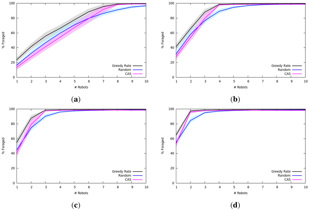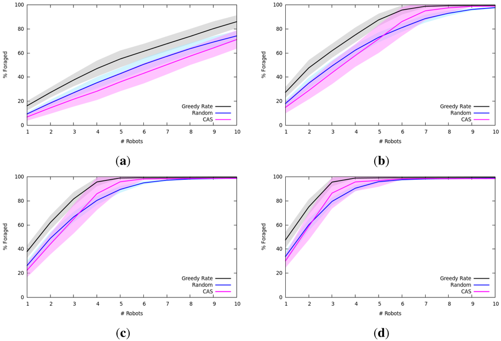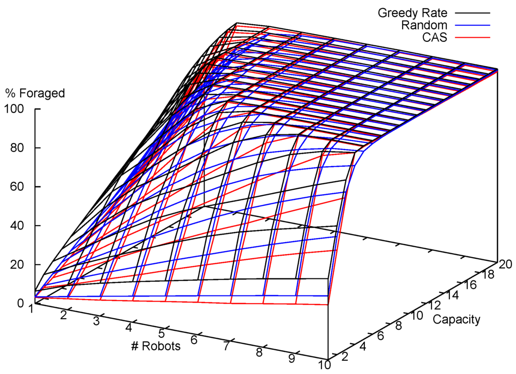 Thus, across the number of robots and capacities of the robots, our greedy rate algorithm outperforms the CAS and random algorithms. As the number of robots approaches 10 and the capacity approaches 20, all of the algorithms approach 100%, which is why we stopped the experiments at those values.