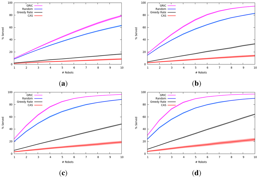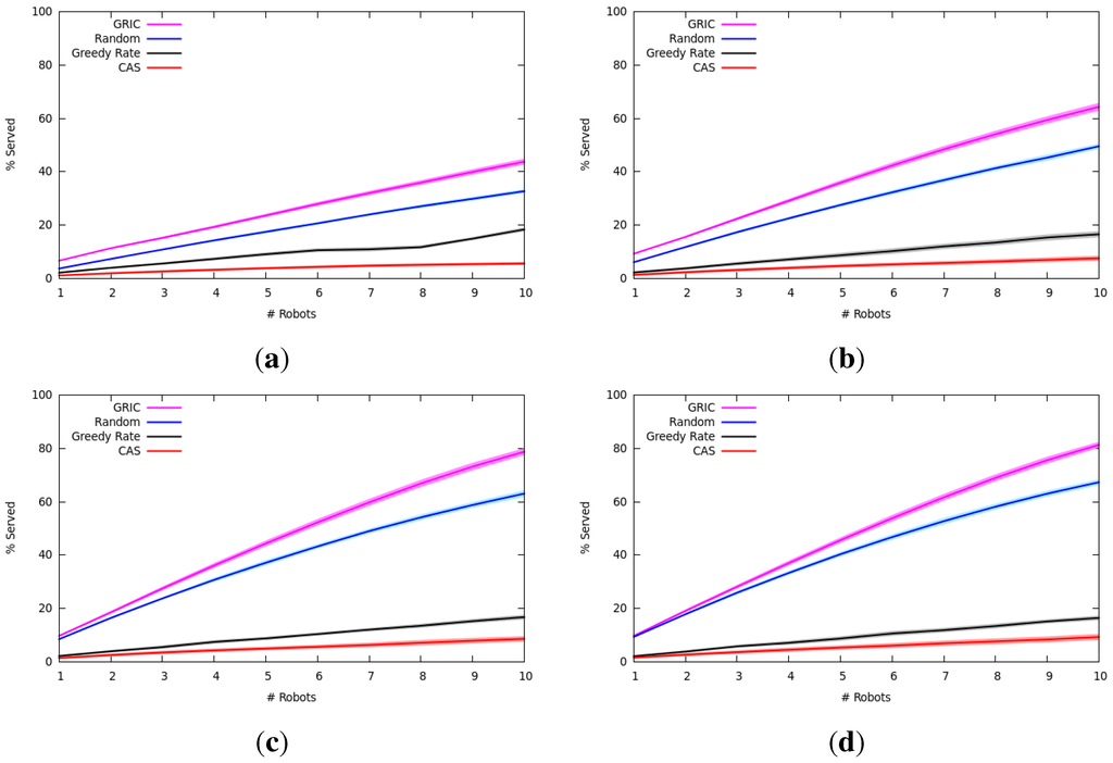 Figure 9a,b show the results of the experiments with the Poisson demand generation model. Our GRIC algorithm consistently serves the highest number of demands, regardless of number of robots, robot capacity or robot speed. Figure 10 and Figure 11 show 2D segments of Figure 9a,b respectively (where the shaded regions around the lines show the standard deviations of the results) and demonstrate that GRIC outperforms GR, random and CAS.