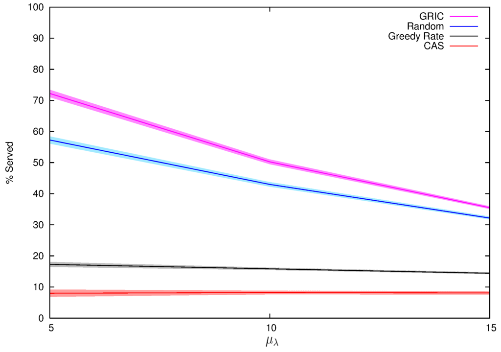 Figure 12 shows the effect of increasing the mean of the normal distribution from which the Poisson parameters of the demand generation model are drawn, where the shaded regions show the standard deviations of the results. As rises, more demands are generated in the world. Greedy rate and CAS manage to keep pace with the rise in generated demands by serving more demands, hence roughly the same percentage gets served. However, the percentage of demands served by the GRIC and random algorithms falls.