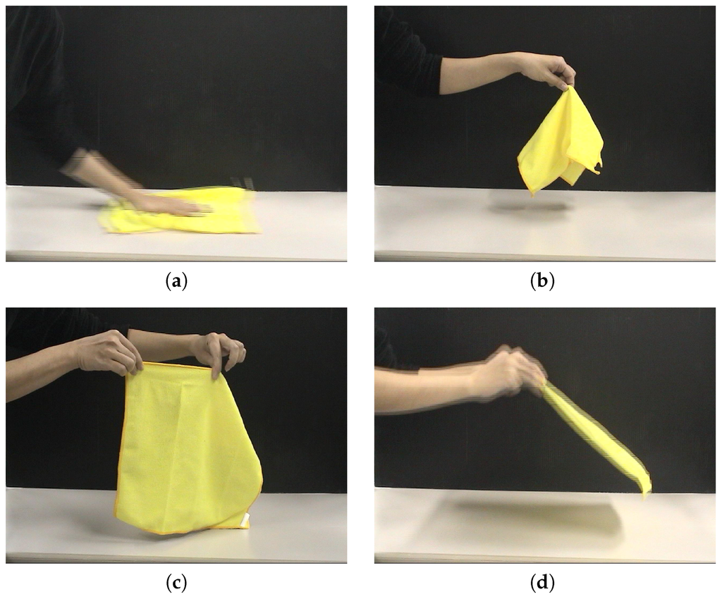 - Wiping motion: a human hand in contact with a fabric displaces and deforms a fabric on a floor (Figure 1a). No slippage between the hand and the fabric occurs during displacement.