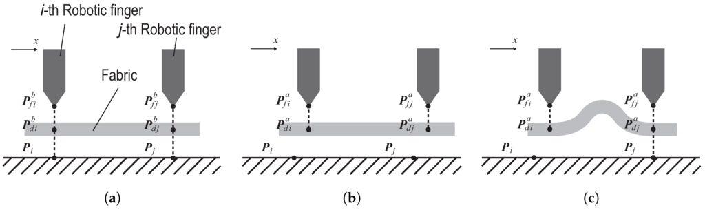 Figure 2 shows a sample task of two manipulators moving in one dimension, where the i-th and j-th fingers () handle a deformable object on a floor. To better view the fingers, they are shown separately. In this example, we assume that the deformable object is thin and without shear; thus, the initial conditions of these points satisfy the equations (Figure 2a):