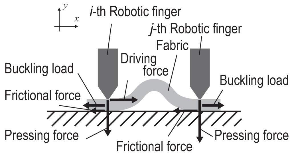 where is the pressing force of the j-th finger. This analysis assumed that the masses of the i-th and j-th fingers were identical. Equation (12) shows that a pressing force is required to be large enough to hold the fabric onto the floor; however, if Equation (9) is satisfied, a wrinkle must be generated during wiping deformation. According to Equation (9), the frictional coefficients of the manipulated object are significant for this strategy. In these analyses, we assumed that there is no unexpected disturbance during the manipulation. The manipulated fingertips may slip on the fabric surface by unexpected disturbances if the condition of Equation (9) is satisfied. The fingertip’s slippage on the object by the disturbances will decrease the working precision.