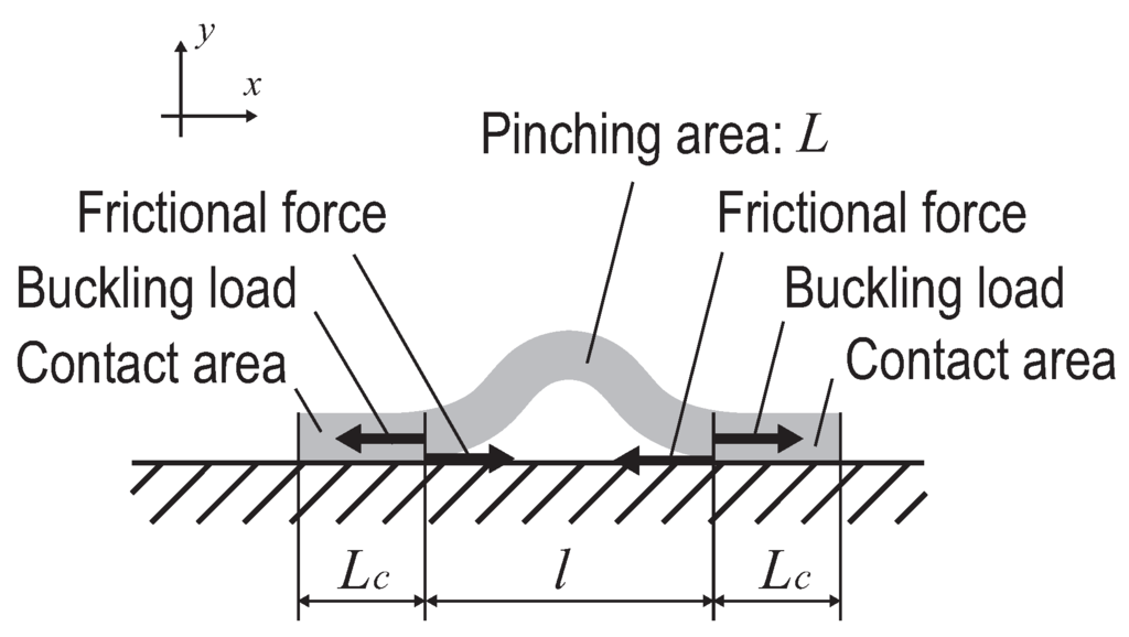 with the frictional force being equal to in this situation. We assumed that the bending moment of the wrinkle can be summarized as the buckling load of a uniform beam fixed at both ends. The buckling load P can be described as: