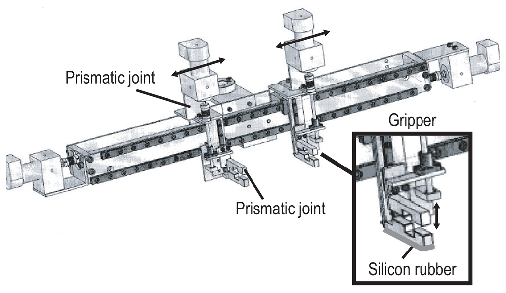 Based on the above results, we constructed a robotic hand consisting of two grippers, each of which could move independently in both vertical and horizontal directions. Thus, this hand had four degrees of freedom (Figure 8). Two grippers moving vertically could pinch a fabric, whereas their horizontal movement could wrinkle the fabric to create a pinching area. Silicon rubbers were mounted onto the bottom of each gripper to improve the frictional force. The horizontal and vertical joints were composed of two ball screws and two trapezoidal screws, respectively. Each joint also was composed of individual DC motors. The prototype robotic hand was mounted onto a scalar arm (made by Mitsubishi Electric, Tokyo, Japan) with four degrees of freedom. To realize easily the pressing motion and wiping deformation, we utilized a scalar arm with parallel grippers in this system. The hand wrinkled the fabric using the following four-step strategy: