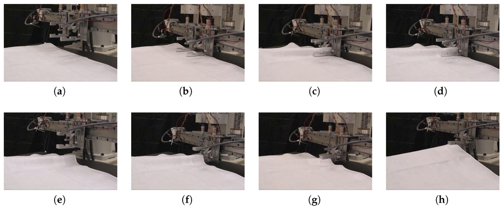 Figure 9 shows successive images of the pinching motion. As a fabric specimen, we used a rectangular cotton handkerchief, measuring 450 mm × 430 mm; its physical properties are shown in Table 1. In step (a), a stereovision system detected the edge of the fabric. In step (c), the grippers made a pinching area, whereas, in step (d), the grippers partially released this area. These steps resulted in hysteresis for bending rigidity of the fabric. In general, bending rigidities of fabrics have hysteresis properties against the flexures. With hysteresis, the bending rigidity may become smaller for stable shapes depending on how to inflect the fabric; hence, based on Equation (14), the creation of a pinching area can be changed by the hysteresis effect. That is, this effect of hysteresis may be considered a dexterous manipulation by a robotic hand. We will evaluate the success rate of pinching should be investigated including this effect of hysteresis in future. In this experiment, the length of the pinching area L was set at 60 mm and the distance between the two fingers after wiping deformation l was set at 30 mm.