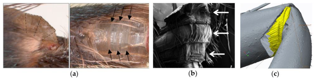 Images showing spider joint membranes: (a) Microscope images (Microscope recordings in cooperation with Dr. Helmuth Mägdefrau, Tiergarten Nuremberg and Hendrik Bargel, University of Bayreuth, BioMat—Institute of Biomaterials) structure of a Grammostola Rosea; (b) SEM images of a Lasidora Parahybana; (c) Reverse-engineered microcomputed tomography (Micro CT scans and reverse engineering in cooperation with Jens Runge and Dr. Christian Wirkner, University of Rostock, Institute of Biosciences, Department of Zoology) of a Cupiennius Salei.