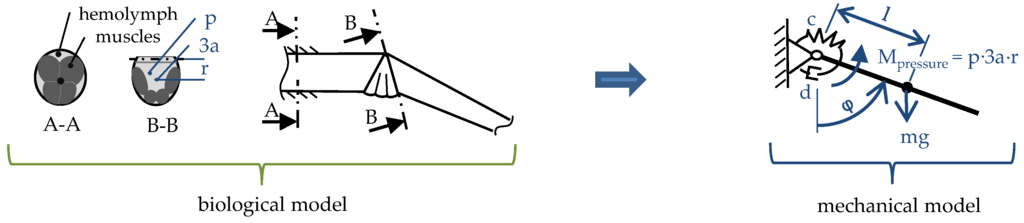 Also important for a biomimetic transfer into a robotic actuator are biomechanical calculations of the hydraulic extension. Zentner [32,33,34] mathematically described the rotational extension of the spider leg joint by using a rigid body modelling, schematically illustrated in Figure 4.