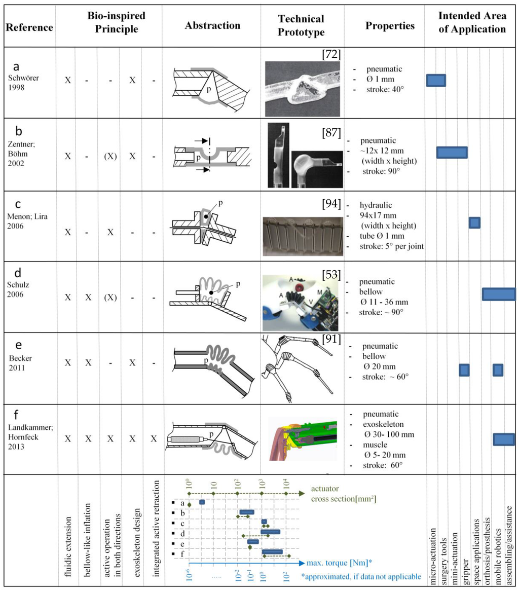 As said, this study is focused on biomimetic actuators inspired by spider leg joints. Therefore, robotic devices like joints with conventional electric motors or classical piston-cylinder hydraulics/pneumatics are not taken into account and the focus is on biomimetic developments.