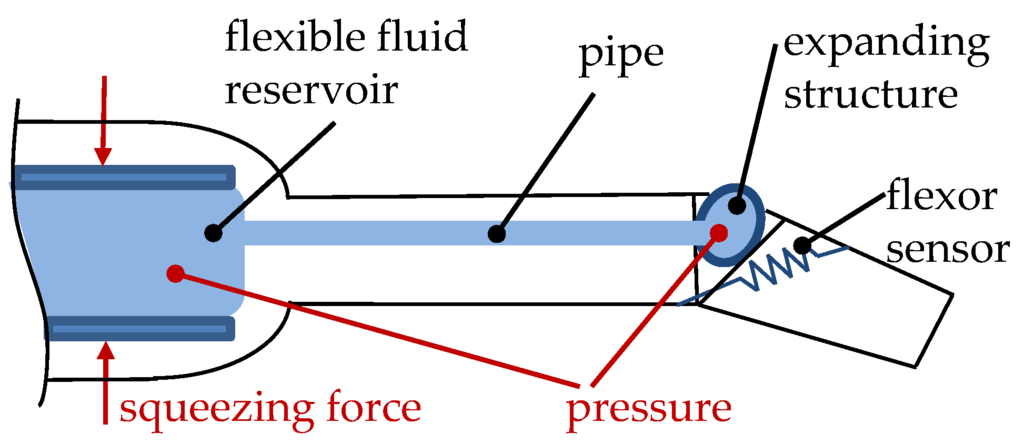 The “smart stick” (Figure 7c) was developed by Menon and Lira [88,94] investigating various properties of the whole spider for their use in space applications. They focused on the principle of hydraulic extension and used a flexible tube (Ø 1 mm), which is placed perpendicular between spacing elements. Each joint element yields a deformation of up to 5 degrees while actuated with up to 1.2 MPa of hydraulic pressure. Several joints can be placed in a row to reach the desired rotational angle or end effector point. The closed fluid loop circuit illustrated in Figure 8 has not yet been fully described and therefore presents another research opportunity. Squeezing the body or one end of the tube leads to a volume shift and to a rotational movement of the joint, which is retracted by a passive mechanical spring [88].