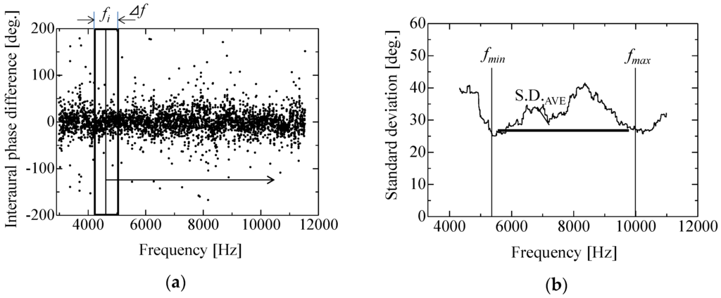 Method for evaluating statistical properties of binaural signals: (a) method for calculating the frequency spectrum of standard deviation from short-term IPDs of binaural signals; and (b) frequency spectrum of the standard deviation and its average value from fmin to fmax.