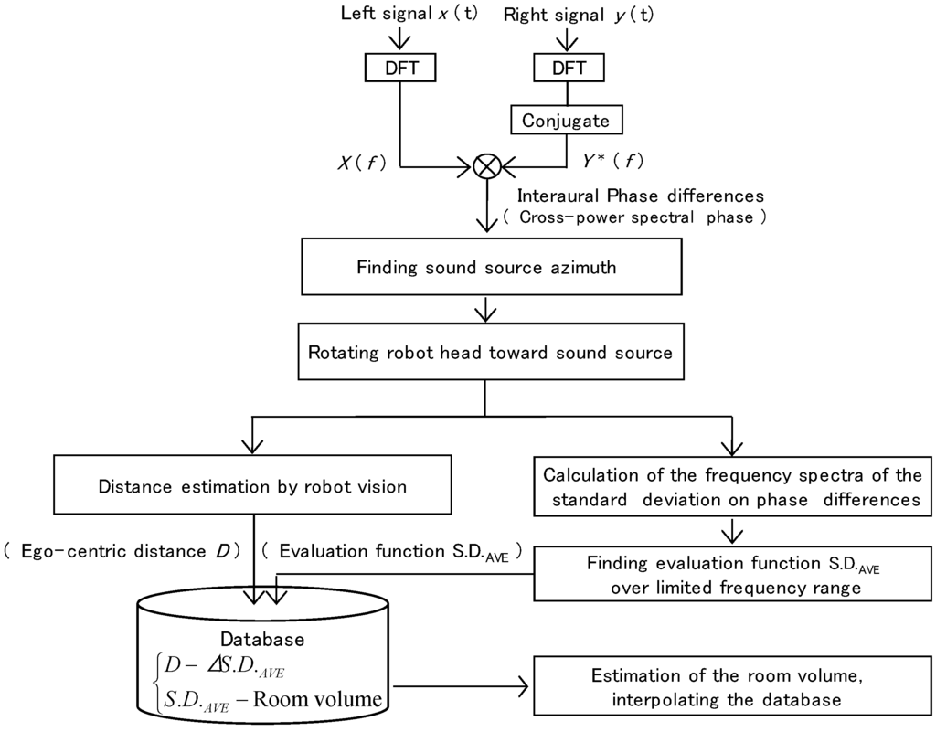 In Section 2, the methods and procedures are presented. The ego-centric distance by robot vision and the statistical properties of sound by robot audition are described. A procedure for evaluating the statistical properties of IPDs is described. Other procedures include localizing the sound source, rotating the robot head toward the sound source, and preparing the database. The experimental measuring system is also described, which consists of eight room measurements and volumes. The statistical properties of IPDs in a short-term frequency analysis are shown in Section 3. The prepared database and the results of room volume estimations in unknown rooms are shown. The effect of surrounding obstacles on the room volume estimation is described. In Section 4, experimental results are discussed in comparison with the results of conventional methods. Finally, in Section 5, a summary is given.