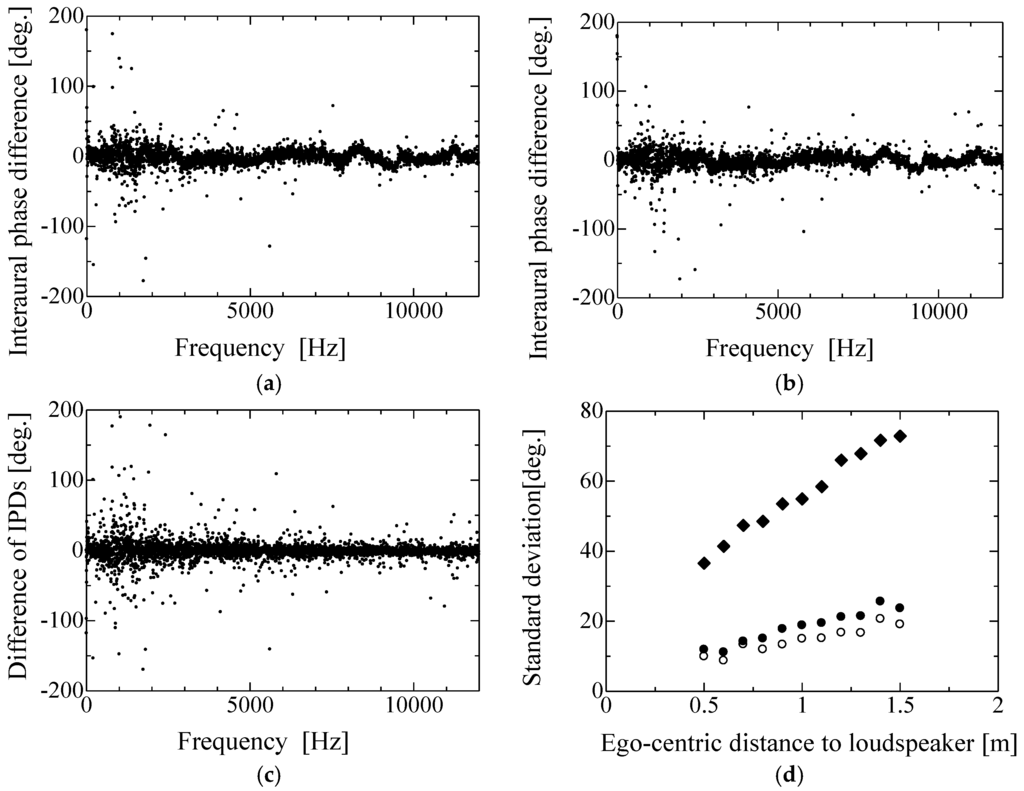 The statistical properties of the IPDs of sound pressure in a short-term frequency analysis are next discussed. The short-term IPDs measured in the reverberation rooms fluctuate temporally [11,18]. One room and one distance were tested first. One loudspeaker was located at a distance 1 m from the robot head. Figure 7a,b show the two IPDs measured under the same conditions. Though they have almost the same properties, they are not identical. As shown in Figure 7c, which is a plot of the differences between the two IPDs, the differences fluctuated randomly over the full measuring frequencies. Three rooms and several distances were tested next. The standard deviation was introduced for quantizing the fluctuations. The relation between the standard deviation and the ego-centric distance according to the three room sizes is shown in Figure 7d. The standard deviation increased with decreasing room size and increasing distance of the source. This indicates that short-term IPDs are ambiguous, unrepeatable, and unreliable for a distant sound source.
