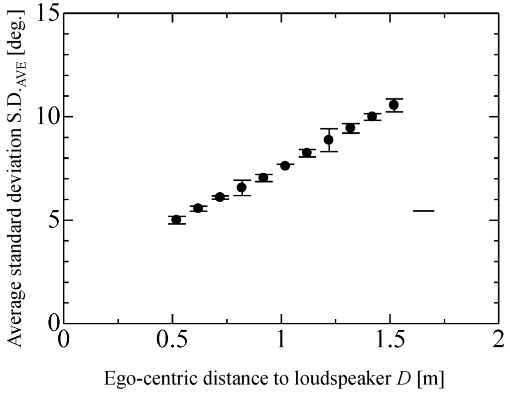 Relation between S.D.AVE and the ego-centric distance to loudspeaker. S.D.AVE is repeatable and steady for measurement repetitions under same conditions.