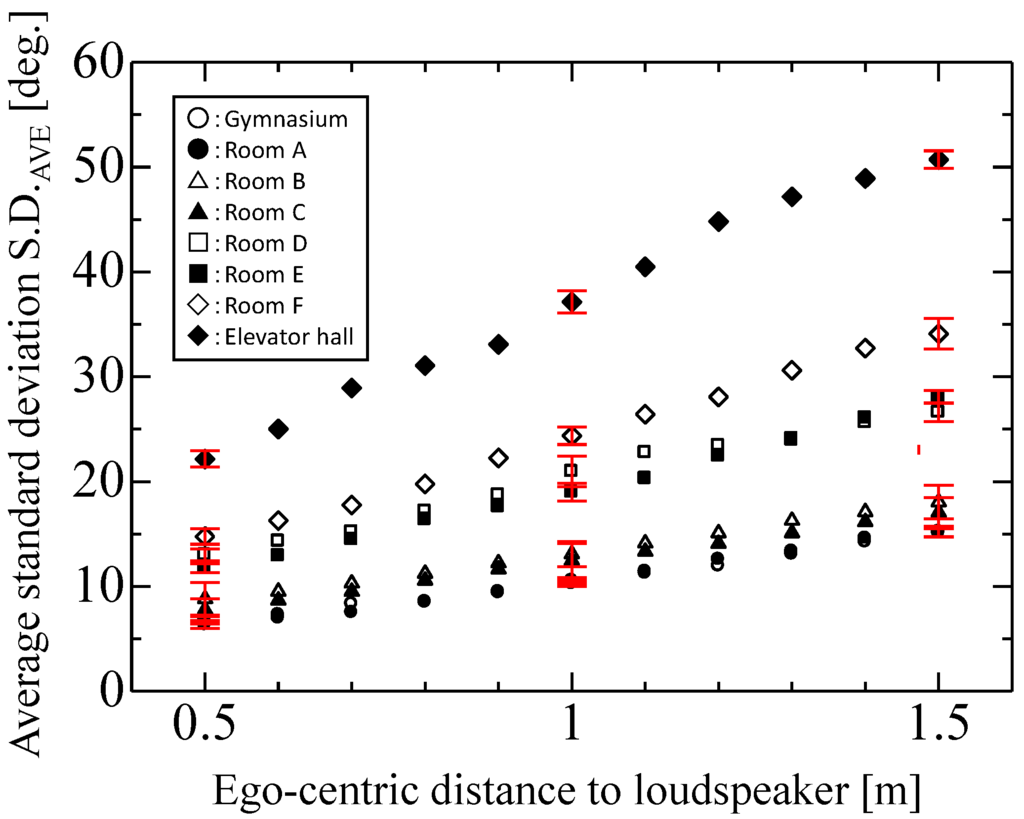 Figure 9 shows that the values of S.D.AVE were proportional to the ego-centric distance in the eight rooms of different volumes listed in Table 1. The slopes of S.D.AVE with respect to the ego-centric distance depended on the room volume. S.D.AVE values of the short-term IPDs increased with decreasing room size when the distance was held constant. The values of S.D.AVE were compared in eight rooms at distances 0.5 m, 1.0 m, and 1.5 m, when the IPDs were measured repeatedly under the same conditions. Taking account of the repeated measurement fluctuations, these rooms can be categorized into four room sizes for the relatively long (1.5 m) ego-centric distance from the loudspeaker: small (elevator room), middle (room F), intermediate (rooms D, E), large (gymnasium, and rooms A, B, and C). The corresponding room volumes were 70 m3, 113 m3, 347–367 m3, and 726 m3 and above according to the values of S.D.AVE. The room volumes are clearly distinguished in the smaller rooms (rooms D, E, F, and elevator hall) with a distant sound source due to sound reflection. Large rooms above 726 m3 (gymnasium, and rooms A, B, and C) volume were not as precisely distinguished by the present method.