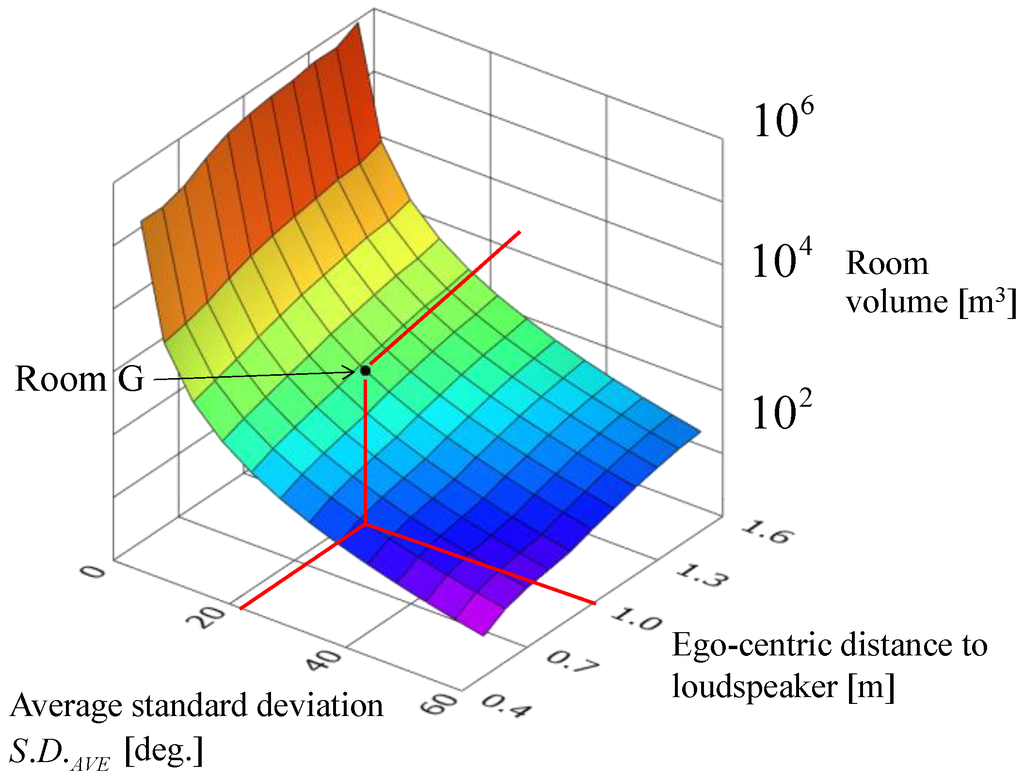 - The proposed average standard deviation is proportional to the ego-centric distance to the sound source. The slope of S.D.AVE with respect to the ego-centric distance depends on the room volume.