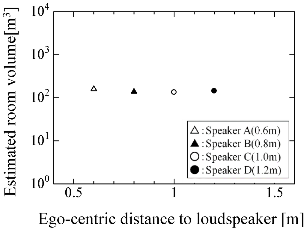 - The room volume is estimated by referring to the database, which contains the relations between the average standard deviation, the ego-centric distance, and the room volume, experimentally defined in advance.