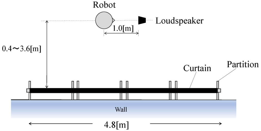 Geometry of the robot, loudspeaker, and obstacles: a wall, partitions, and partitions covered with a thin curtain.