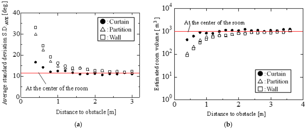 Figure 14 shows: (a) the relations between the distance to the obstacle and the average standard deviation S.D.AVE; and (b) the relations between the distance to the obstacle and the estimated room volume.