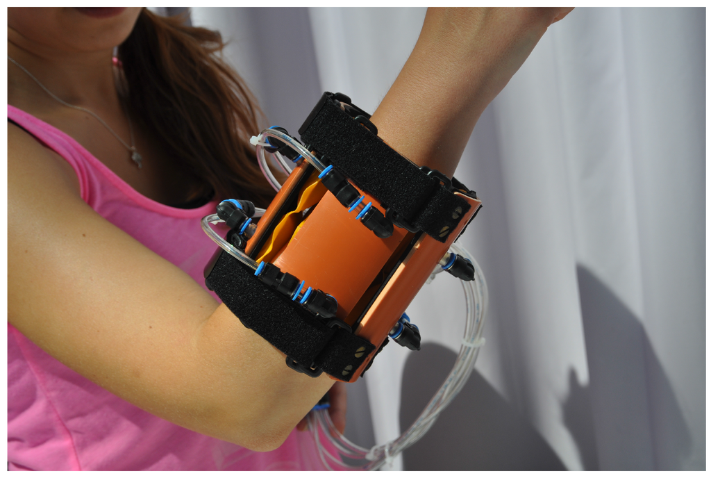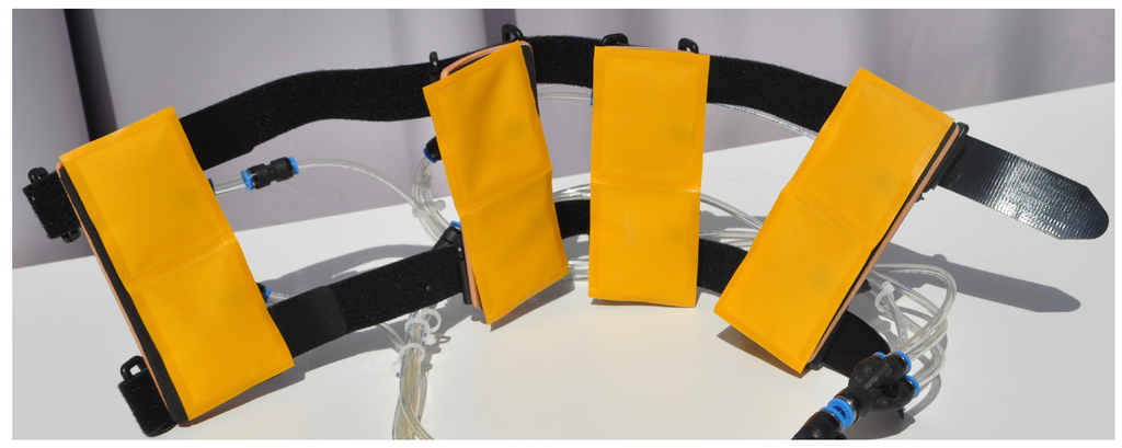 First prototype of sensor system using pneumatic padding for the upper arm based on eight air-pads that are manufactured by the company Dr. Winkler GmbH & Co. KG (Ainring, Germany).