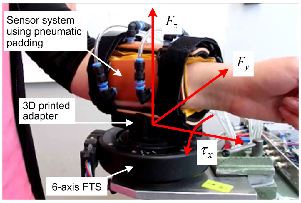 The most common way to measure HRI forces/torques is to apply mostly very expensive but high precision 6-axis FTS between the cuff of the HRI interface and the robot link of exoskeletons [] or robot’s end-effector [,]. Besides high costs, another drawback of this solution is the single-point connection and force/torque transmission which leads to a limitation in flexibility of design. Furthermore, it should be advantageous to measure interaction forces at the whole interface and not only at one specific point, because as described in [] each region of human body has a specific pressure threshold that identifies pain. Surface electromyography (EMGs) is also used as an additional input to get information about patient’s intention to perform particular movement. Examples of EMGs-controlled systems have been proposed by Kiguchi, et al. [] for shoulder rehabilitation and W-EXOS [] for forearm and wrist rehabilitation. But the disadvantage of EMG-applications is, that they have to be attached directly on the skin surface, which is perceived by many people as unpleasant.