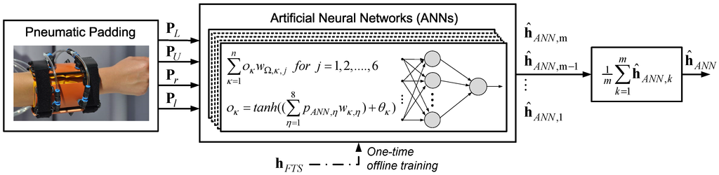 To estimate the interaction forces/torques with the pneumatic padding based on measured data of the eight pressure sensors, a set of ANNs is used. The ANNs are structured as multilayer feed-forward networks, each with one hidden layer, as shown in Figure 6, and were trained one-time offline using the output data of the high precision 6-axis FTS based on the Levenberg-Marquardt backpropagation algorithm using the Neural Network Toolbox provided by Matlab (The MathWorks GmbH, Ismaning, Germany). The vector of HRI forces/torques estimated based on the ANNs is defined as