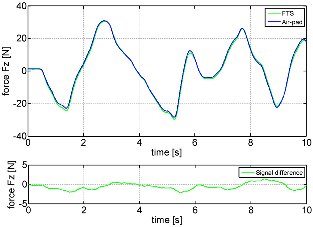 The goal was to verify if it is possible to determine the HRI in such a simple way. For the experiment, the pneumatic padding was used by the subject like shown in Figure 4 and during the test, the subject was asked to perform force only in z-direction. A comparison of estimated HRI force using the pneumatic padding to the measured force using the high precision FTS is shown in Figure 7. The first plot shows the measured force using the FTS as reference system in green and the estimated force using the pneumatic padding based on Equation (5) in blue, the second plot shows the resulting signal difference. It can be concluded, that the force estimation in one direction is possible with the pneumatic padding, with a maximum force difference of approximately N, using the basic force/pressure characteristics as mapping.